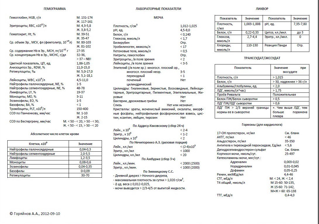 Долго хотел сверстать для себя удобный для использования формат с лабораторными нормами. Сделал. Делюсь. Из недостатков: 1) холестерин для нецелевой аудитории, позже добавлю для ИБСников; 2) нет гормонов, сделаю позже; 3) возможны мелкие опечатки, прошу сообщать, чтобы поправить. Присылайте пожелания: чего НЕ хватает "под стеклом"! С уважением, Сей Сеич