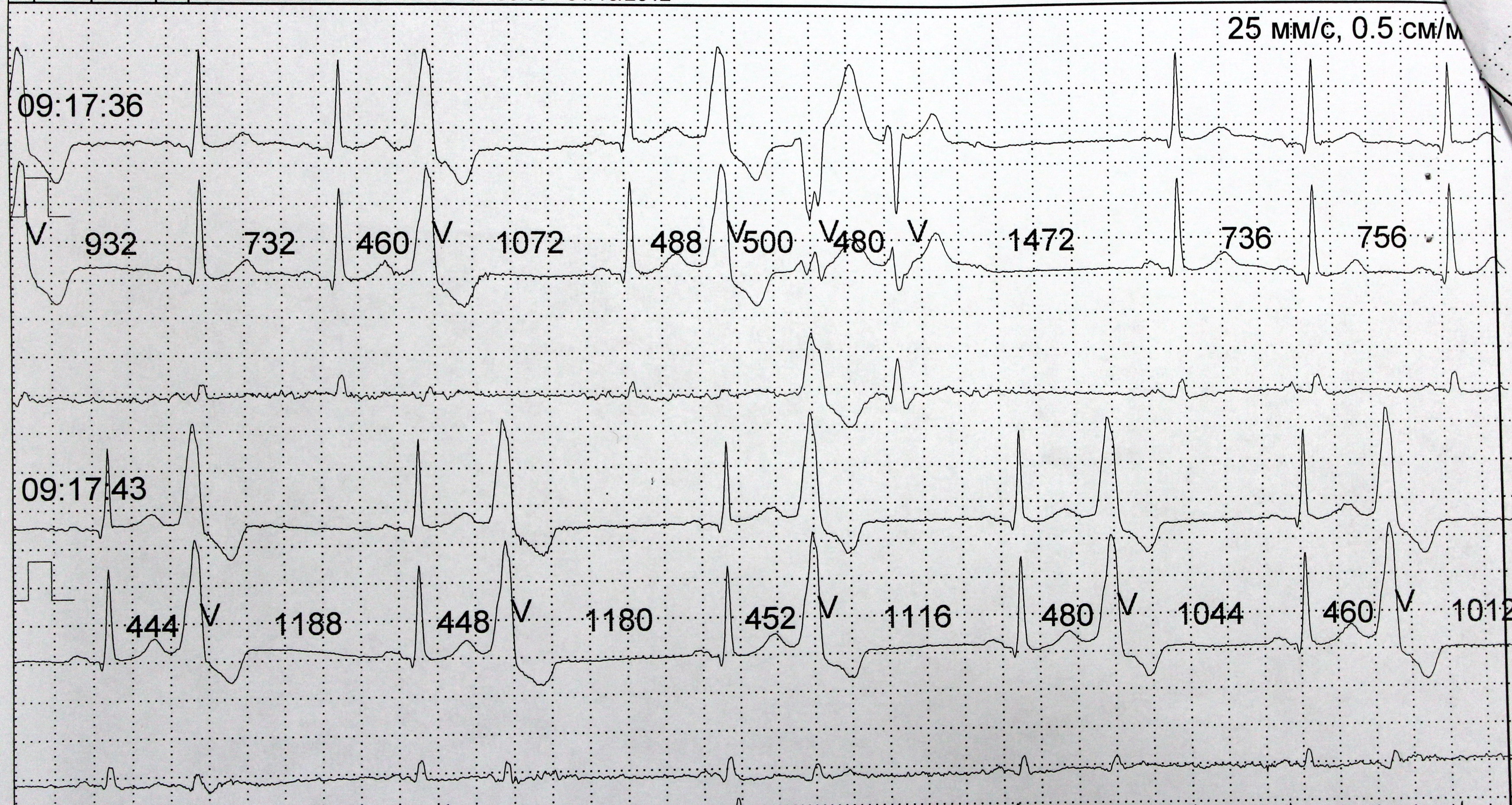 М, 45 лет, больших размеров (высокий и толстый), гипертоник. В ноябре 2011 на ЭКГ желудочковая бигеминия. Назначался конкор 5 мг. На контрольной ЭКГ ЖЭ. Через некоторое время пациент бросил прием конкора. Холтера не было. Около месяца назад появились ноющие боли в области сердца, иногда замирание сердца. На ЭКГ вновь частые ЖЭС, периоды бигеминии. С учетом анамнеза вновь назначен конкор и ренитек. Субъективно лучше. Через 3 недели Холтер. Результаты представляю. Запись 16 часов потому, что отказала батарейка.