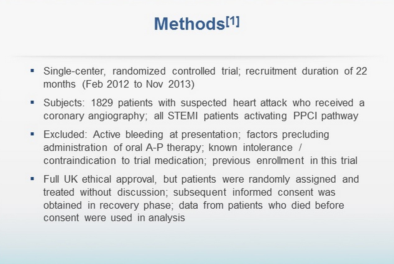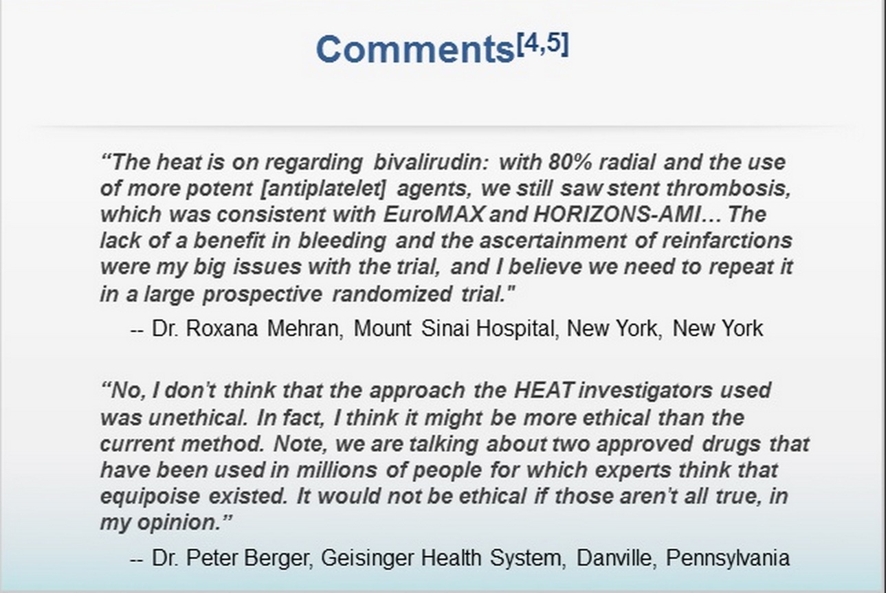 В исследовании HORIZONS было показано, что на госпитальном этапе терапия бивалирудином снижает частоту кровотечений и смертность после первичного чрескожного коронарного вмешательства (ЧКВ), в сравнении с гепарином и традиционными ингибиторами гликопротеина IIb/IIIa (ИГП). Остается неизвестным, сохраняется ли это преимущество бивалирудина при применении монотерапии гепарином с назначением ИГП только в экстренных случаях.
