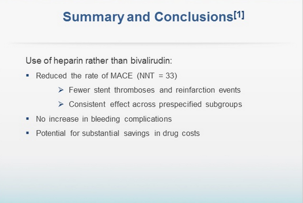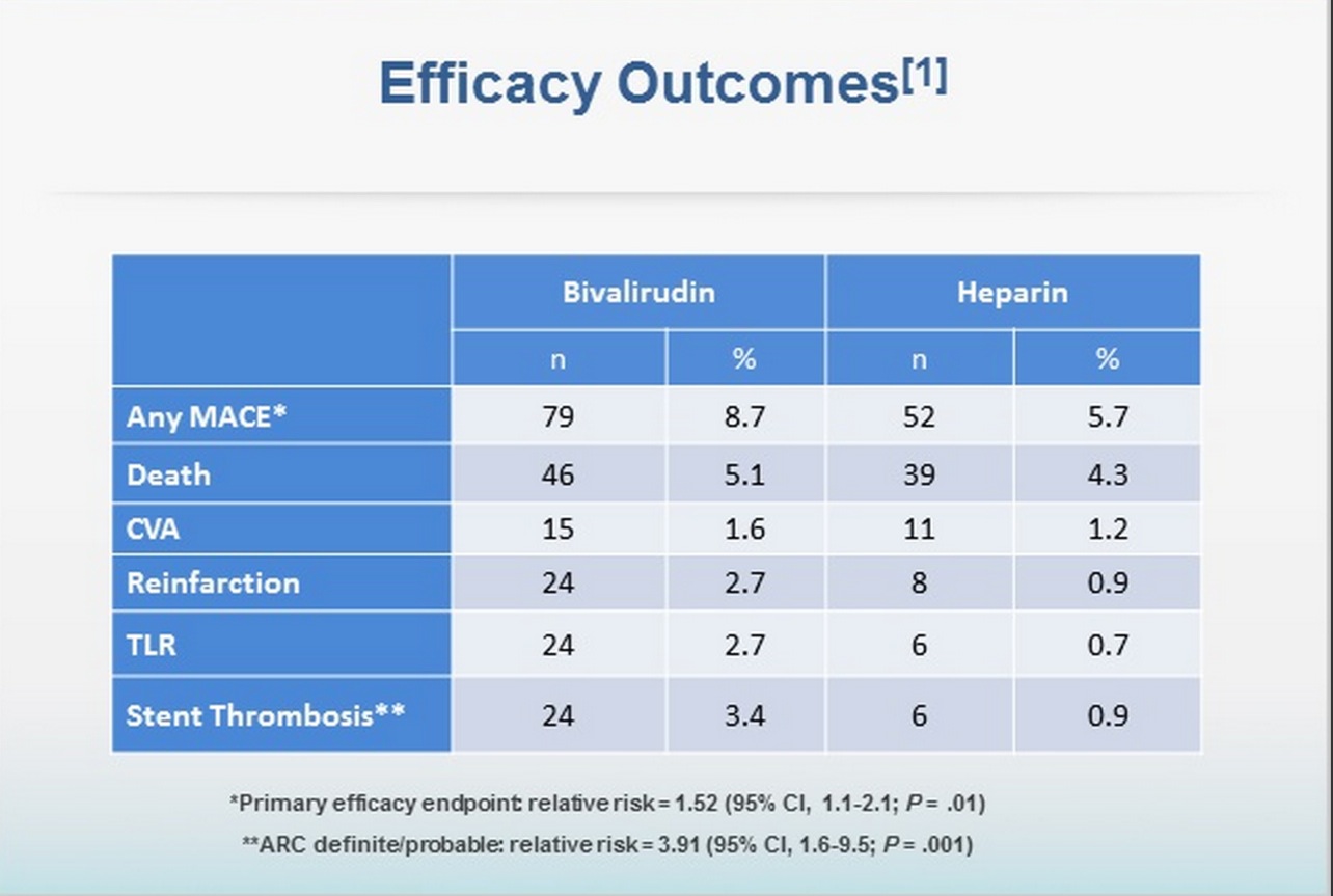 Конечная точка достигнута в 8,7% в группе бивалирудина в 5,7% в группе гепарина. Абсолютное увеличение риска 3%.