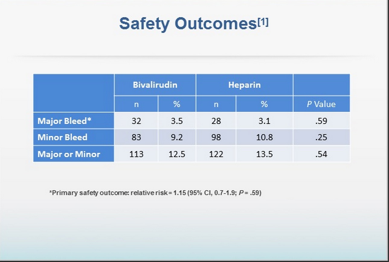В основном конечная точка достигнута за счет повторного инфаркта и повторной реваскуляризации, обе из которых значительно увеличились в группе бивалирудина. Определенный или вероятного тромбоза стента составила 3,4% в группе бивалирудина и 0,9% в группе, получавшей гепарин (RR 3,91, 95% ДИ 1.6-9.5, р = 0,001)