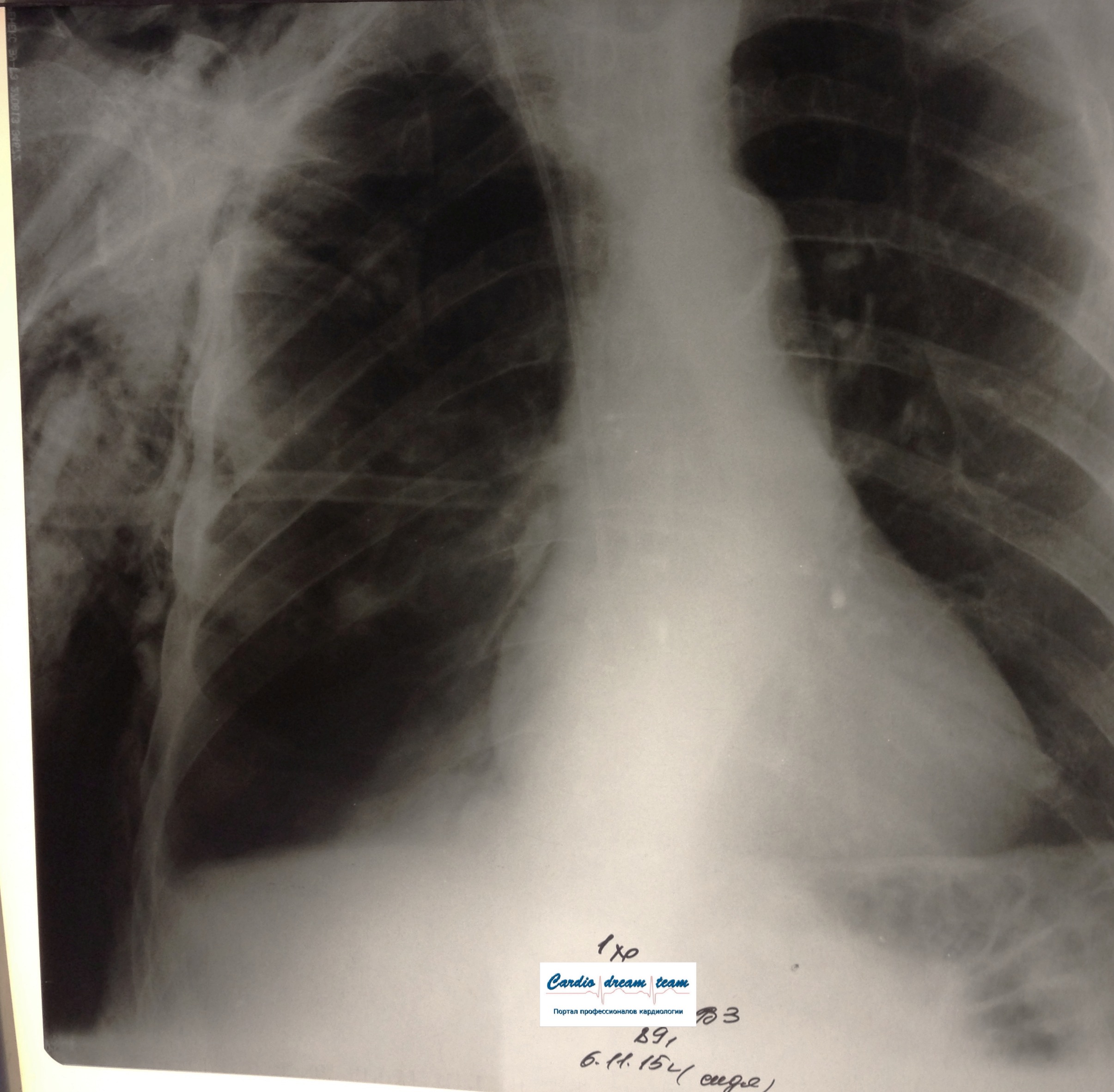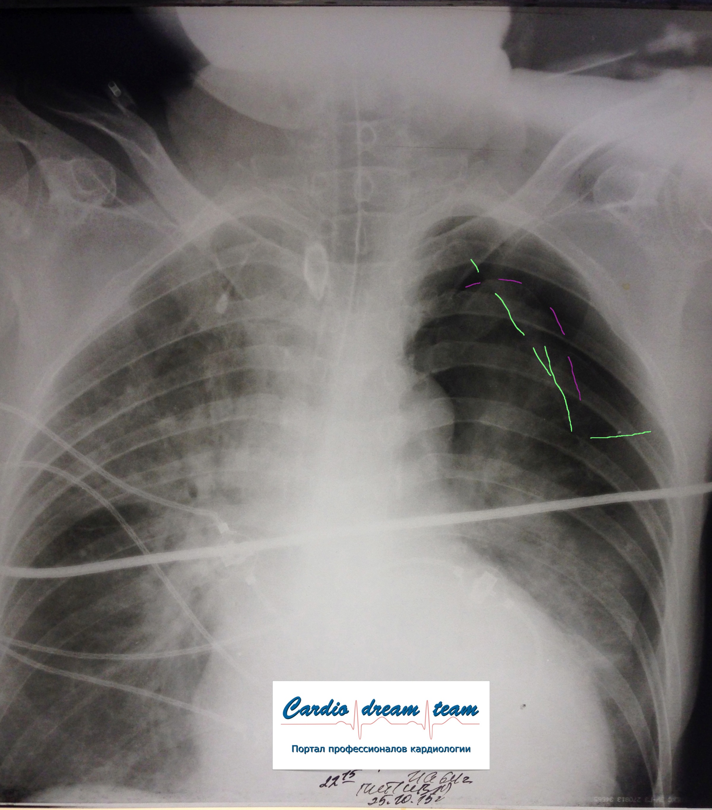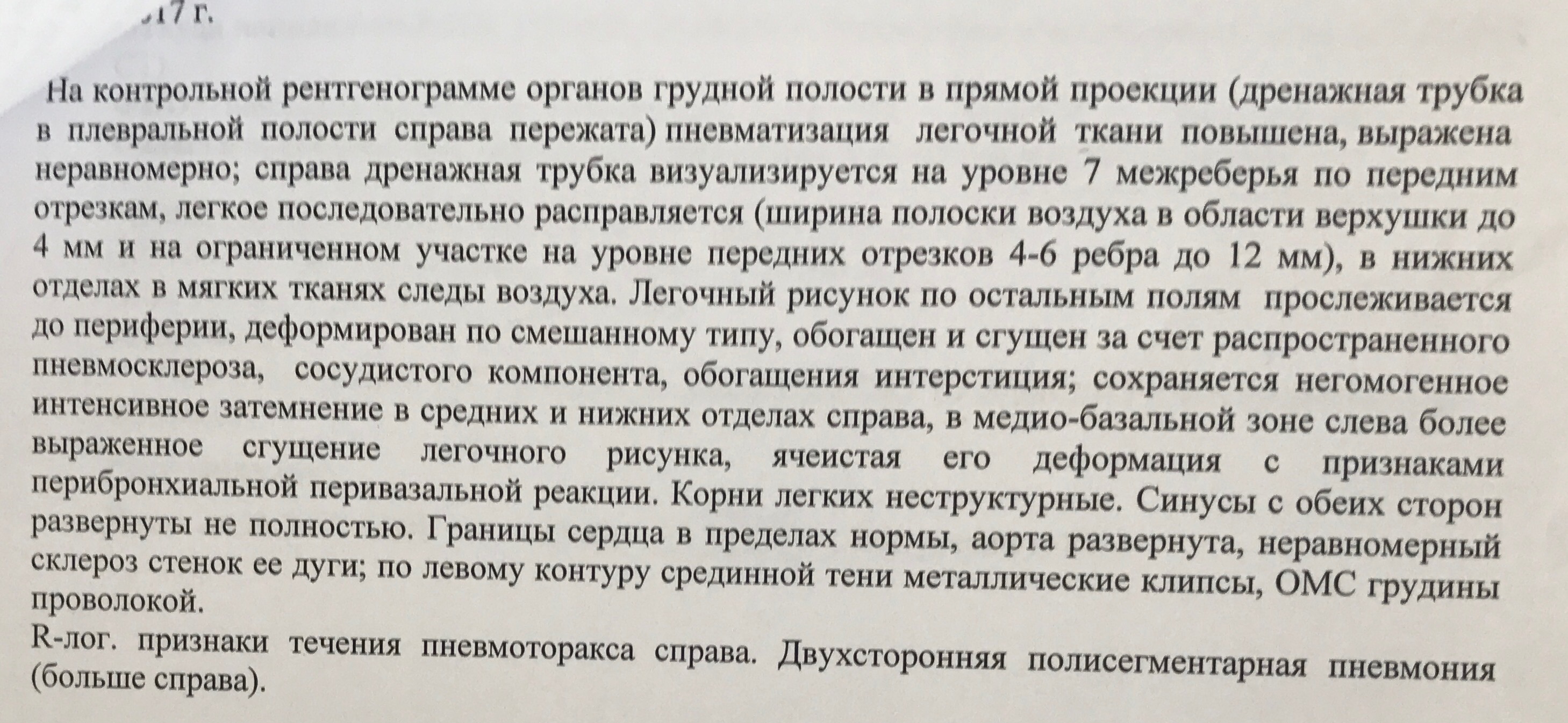 ИССЛЕДОВАНИЕ ОРГАНОВ ГРУДНОЙ КЛЕТКИ Дата 01-ОКТ-15 время 11.30 ОПИСАНИЕ: Проведена рентгенография органов грудной клетки в прямой проекции, положение сидя, условия ПИТ, Р-контроль Легочные поля: Справа легкое расправлено не полностью, апикально до 3го ребра прослеживается свободный газ в плевральной полости. Тень дренажа справа. Тень подключичного катетера в проекции ВПВ. Легочный рисунок: сгущен справа в прикорневой зоне, диффузно деформирован Корни: малоструктурны, обогащены Синусы: нечеткие Сердце: широко лежит на диафрагме (позиционно) ЗАКЛЮЧЕНИЕ: Течение правостороннего пневмоторакса, положительная Р-динамика. Состояние дренирования правой плевральной полости. Р-признаки полнокровия сосудов МКК. Пневмосклероз. Р-контроль .────────────────────────────────────────────────────────────────────── ИССЛЕДОВАНИЕ ОРГАНОВ ГРУДНОЙ КЛЕТКИ Дата 02-ОКТ-15 время 1015 ОПИСАНИЕ: