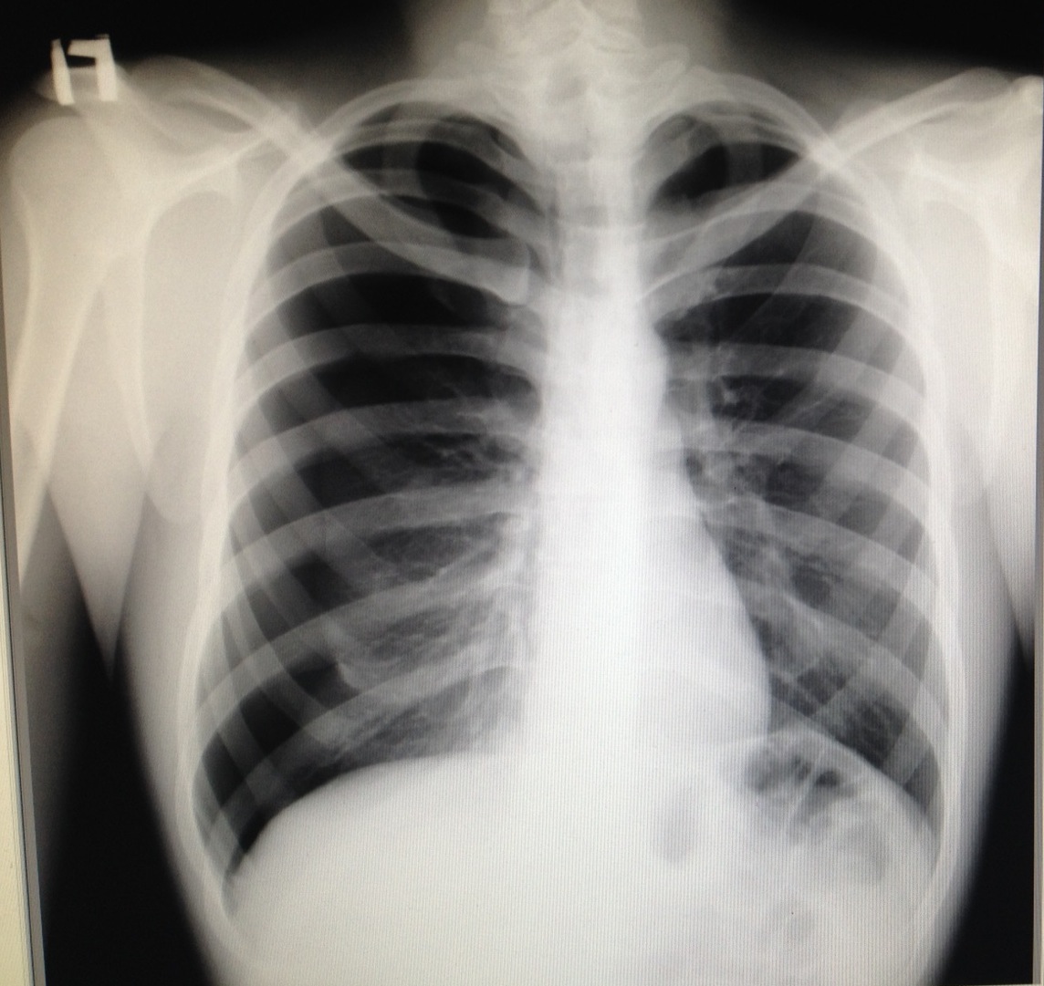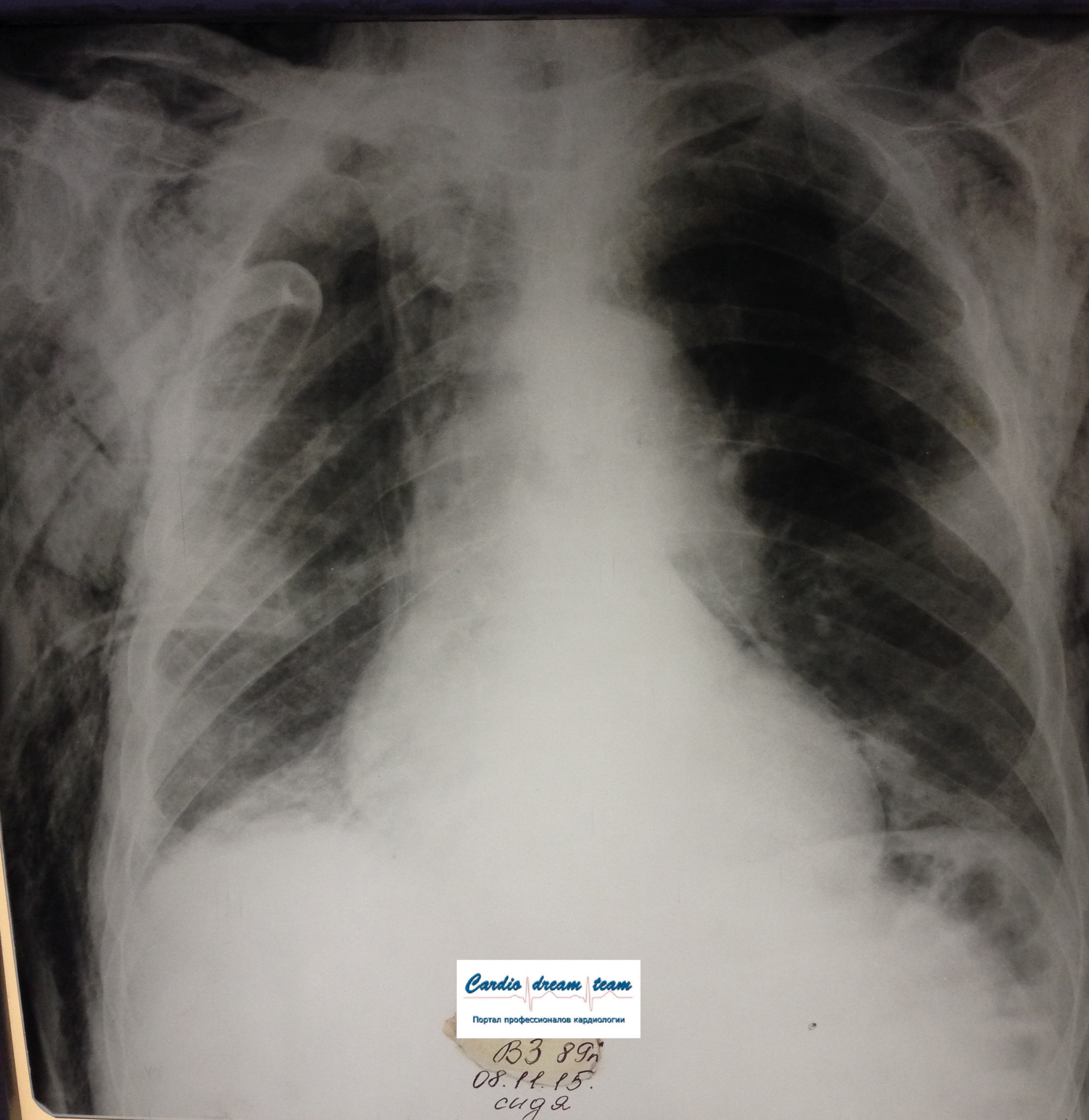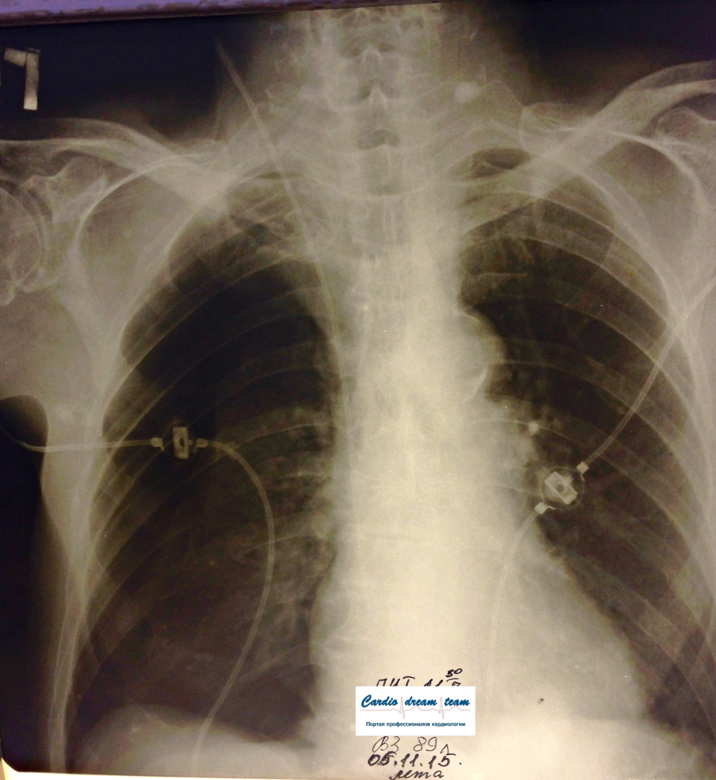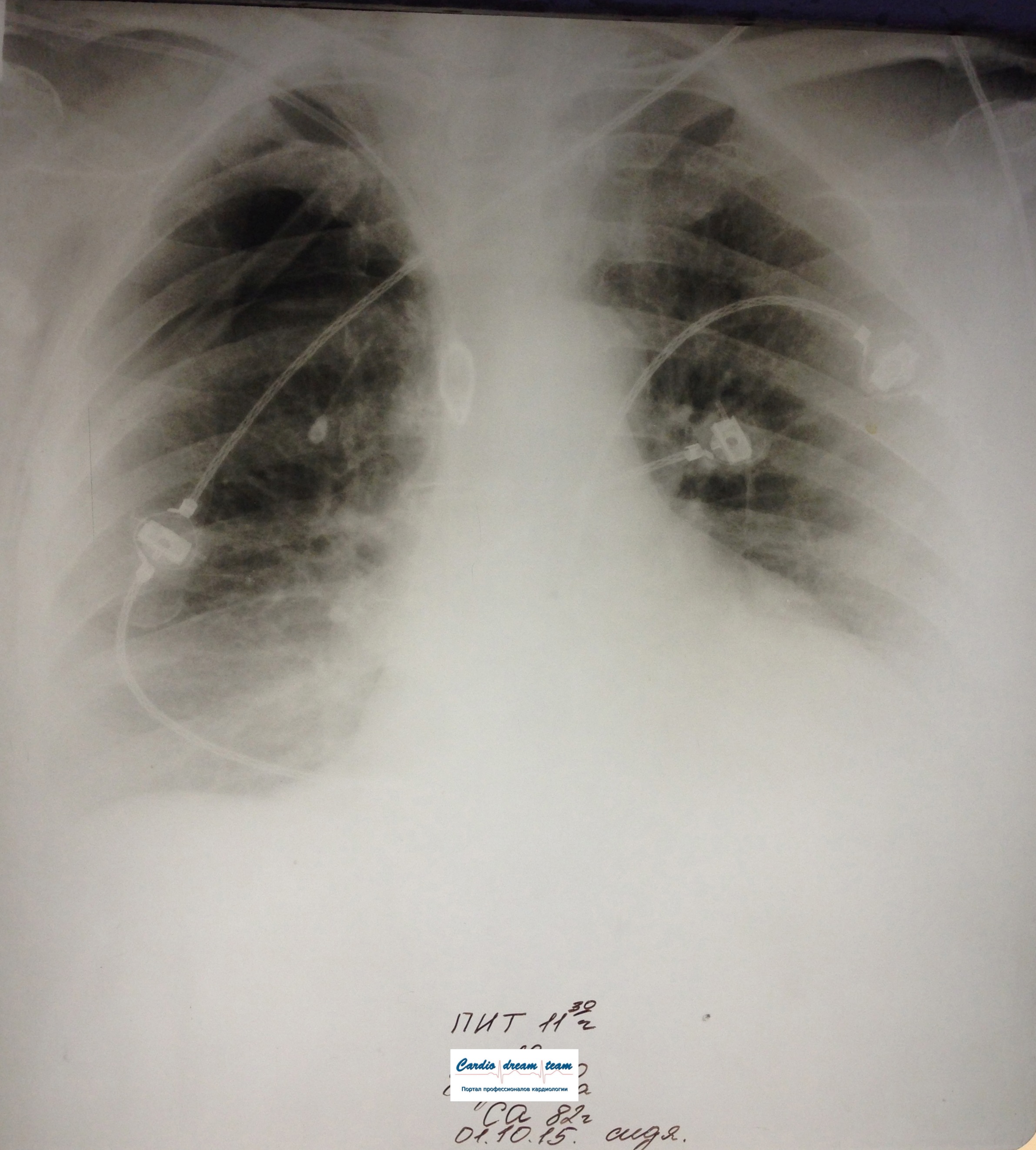 ИССЛЕДОВАНИЕ ОРГАНОВ ГРУДНОЙ КЛЕТКИ Дата 01-ОКТ-15 время 11.30 ОПИСАНИЕ: Проведена рентгенография органов грудной клетки в прямой проекции, положение сидя, условия ПИТ, Р-контроль Легочные поля: Справа легкое расправлено не полностью, апикально до 3го ребра прослеживается свободный газ в плевральной полости. Тень дренажа справа. Тень подключичного катетера в проекции ВПВ. Легочный рисунок: сгущен справа в прикорневой зоне, диффузно деформирован Корни: малоструктурны, обогащены Синусы: нечеткие Сердце: широко лежит на диафрагме (позиционно) ЗАКЛЮЧЕНИЕ: Течение правостороннего пневмоторакса, положительная Р-динамика. Состояние дренирования правой плевральной полости. Р-признаки полнокровия сосудов МКК. Пневмосклероз. Р-контроль .────────────────────────────────────────────────────────────────────── ИССЛЕДОВАНИЕ ОРГАНОВ ГРУДНОЙ КЛЕТКИ Дата 02-ОКТ-15 время 1015 ОПИСАНИЕ: