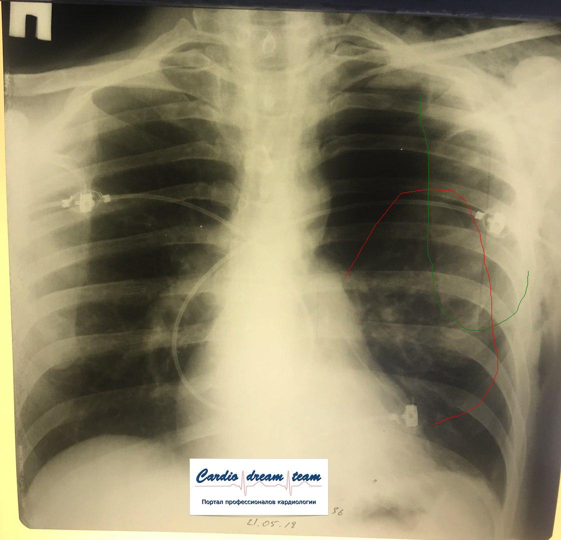 Проведена рентгенография органов грудной клетки в прямой проекции, положение полусидя, условия ПИТ, Р-контроль Легочные поля: Отрицательная динамика: правое легкое поджато к корню. Тень средостения резко смещена влево. Выраженная подкожная эмфизема мягких тканей грудной клетки справа. Тень подключичного катетера в проекции ВПВ. Легочный рисунок: диффузно деформирован за счет пневмосклероза, сгущен справа Корни: тень средостения смещена влево Синусы: нечеткие Сердце: широко лежит на диафрагме (позиционно) ЗАКЛЮЧЕНИЕ: Правосторонний пневмоторакс, отрицательная Р-динамика. Эмфизема мягких тканей грудной клетки. Пневмосклероз. Р-контроль.