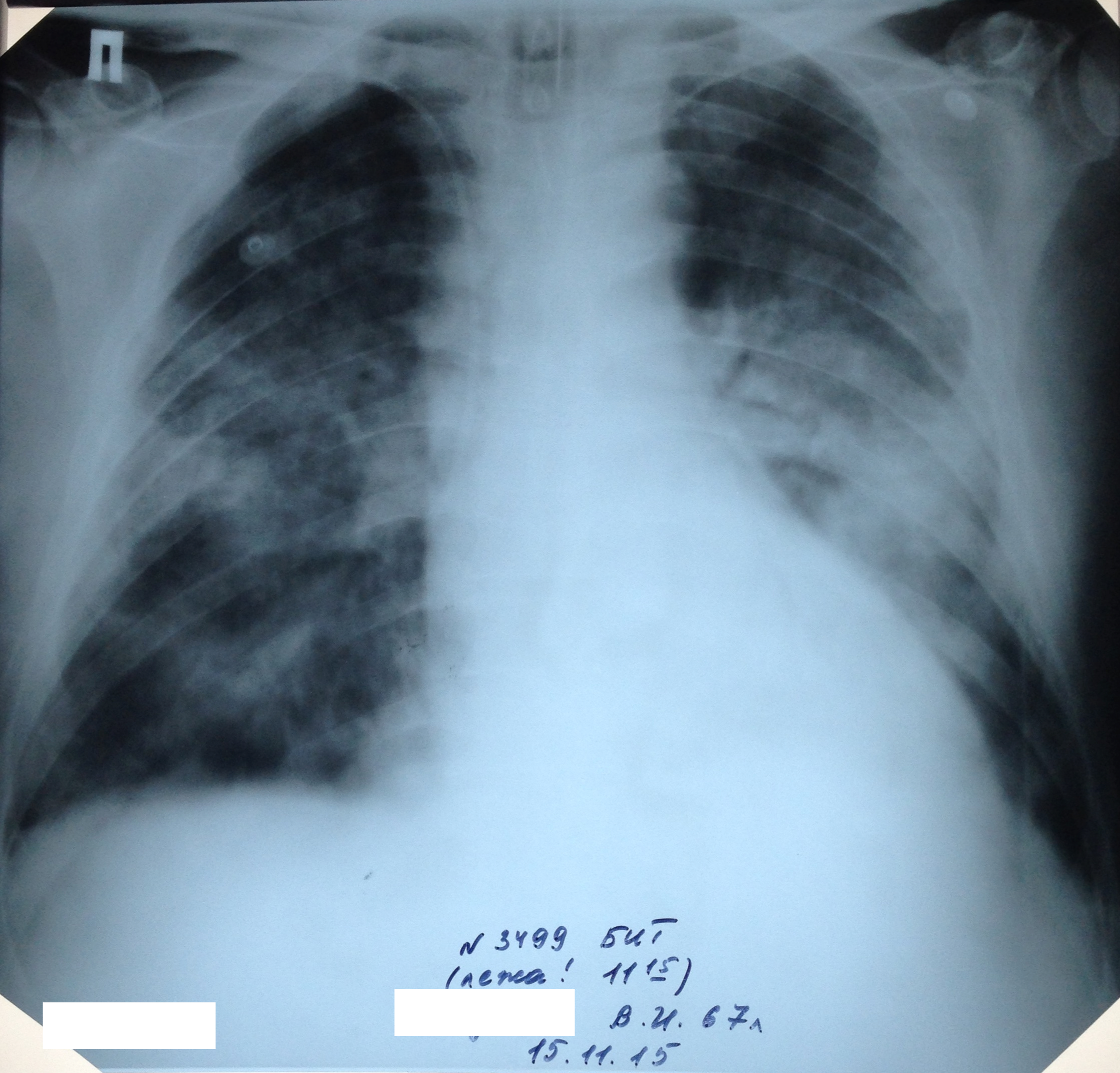 Заключение: Р - признаки правосторонней, нижнедолевой, бисегментарной (S8-9) пневмонии на фоне массивных фиброзных изменений.