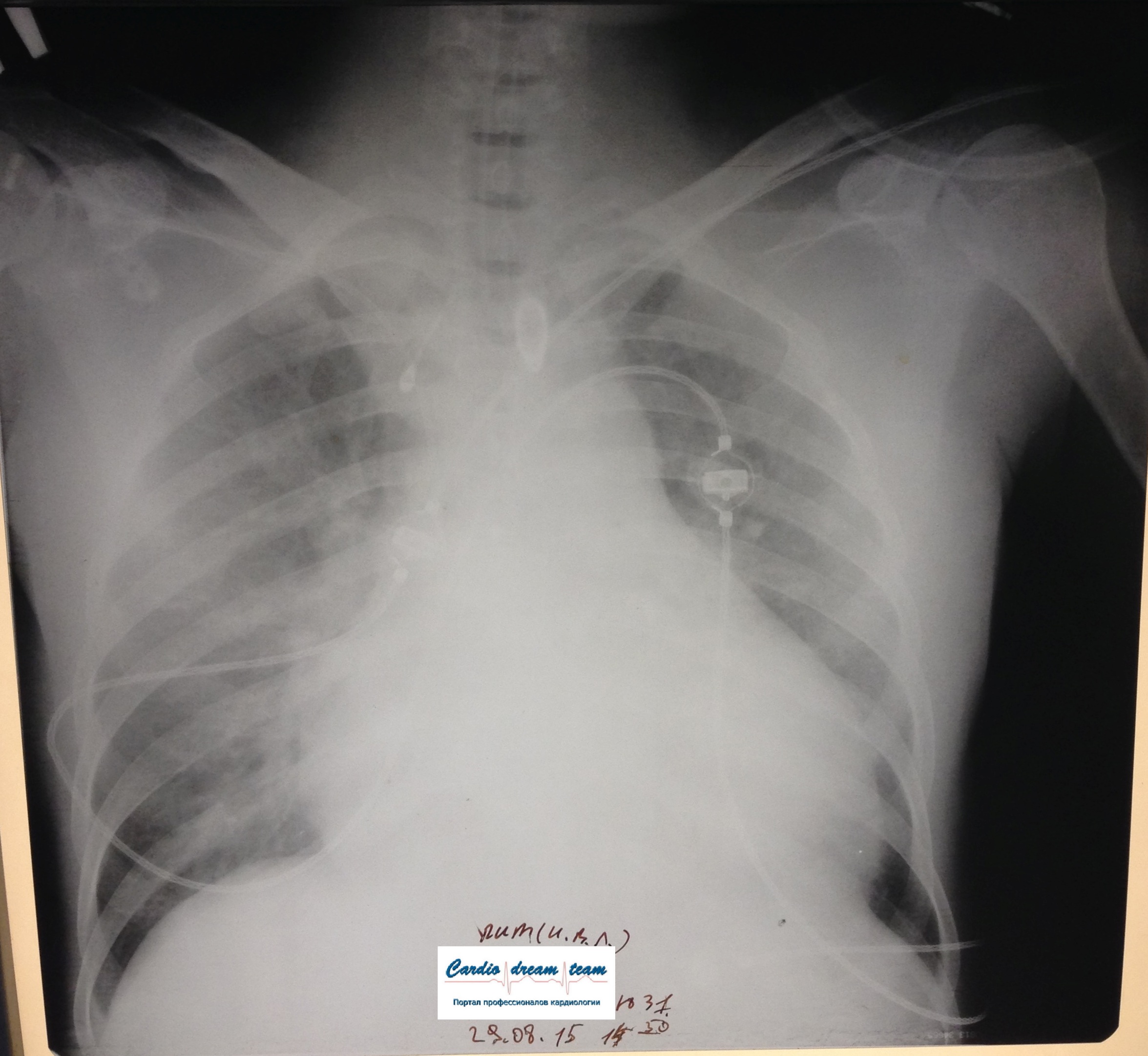 На обзорной цифровой рентгенограмме органов грудной клетки в прямой проекции справа в нижних отделах отмечается снижение прозрачности без четких контуров, слабой и средней интенсивнсоти, за счет инфильтративных изменений. Слева в нижних отделах так же нельзя исключить наличие инфильтративных изменений. Легочный рисунок усилен в зоне инфильтрации. Корни структура снижена, справа инфильтрирован, не расширены. Синусы свободные. Тень средостения без особенностей. Границы сердца не расширены. Аорта не изменена.