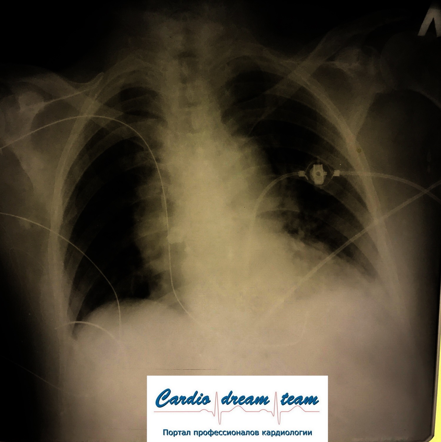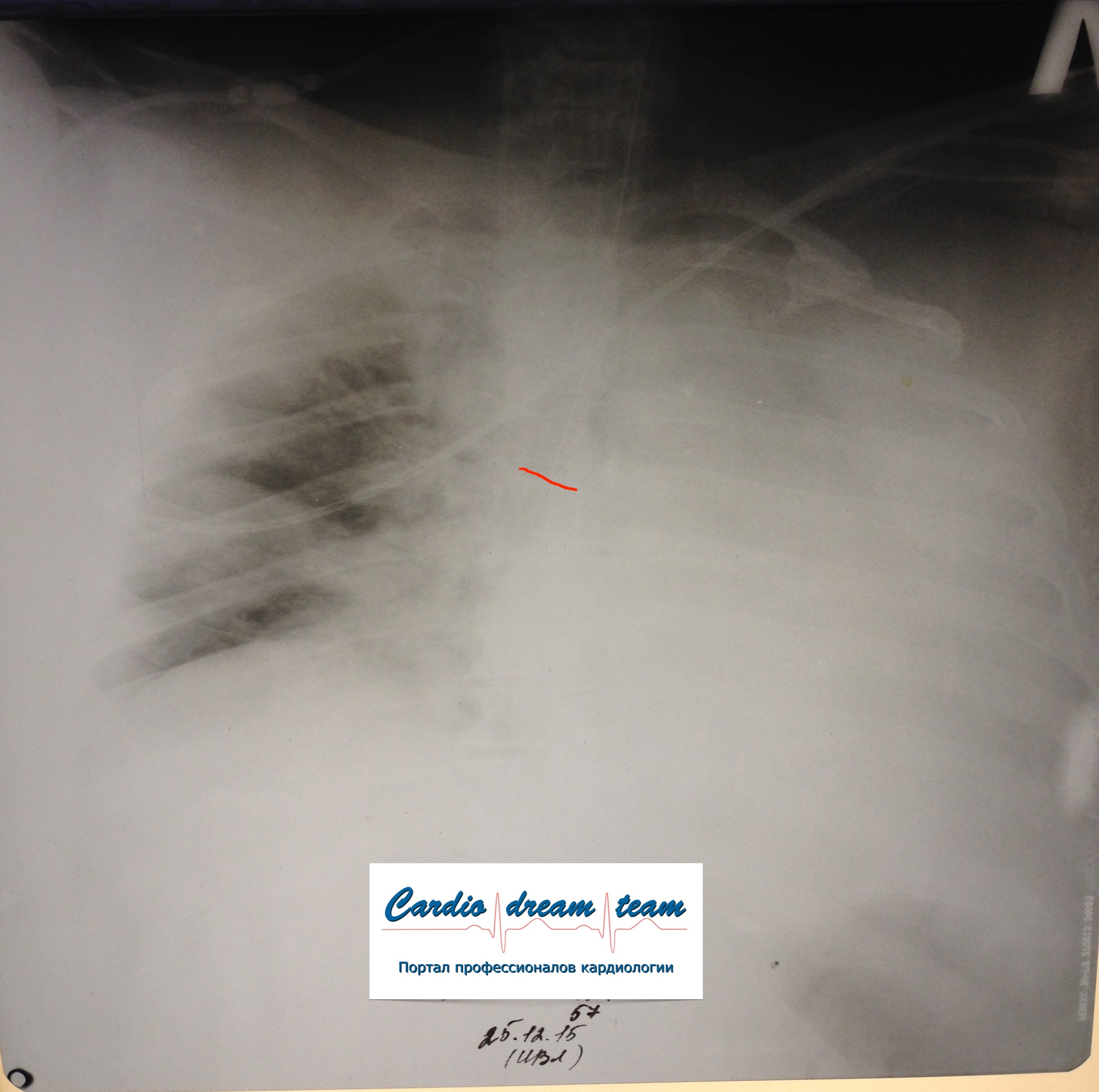 Затемненная рентгенограмма, чтобы посмотреть, что электрод временного кардиостимулятора стоит на месте - уперся в стенку правого желудочка.