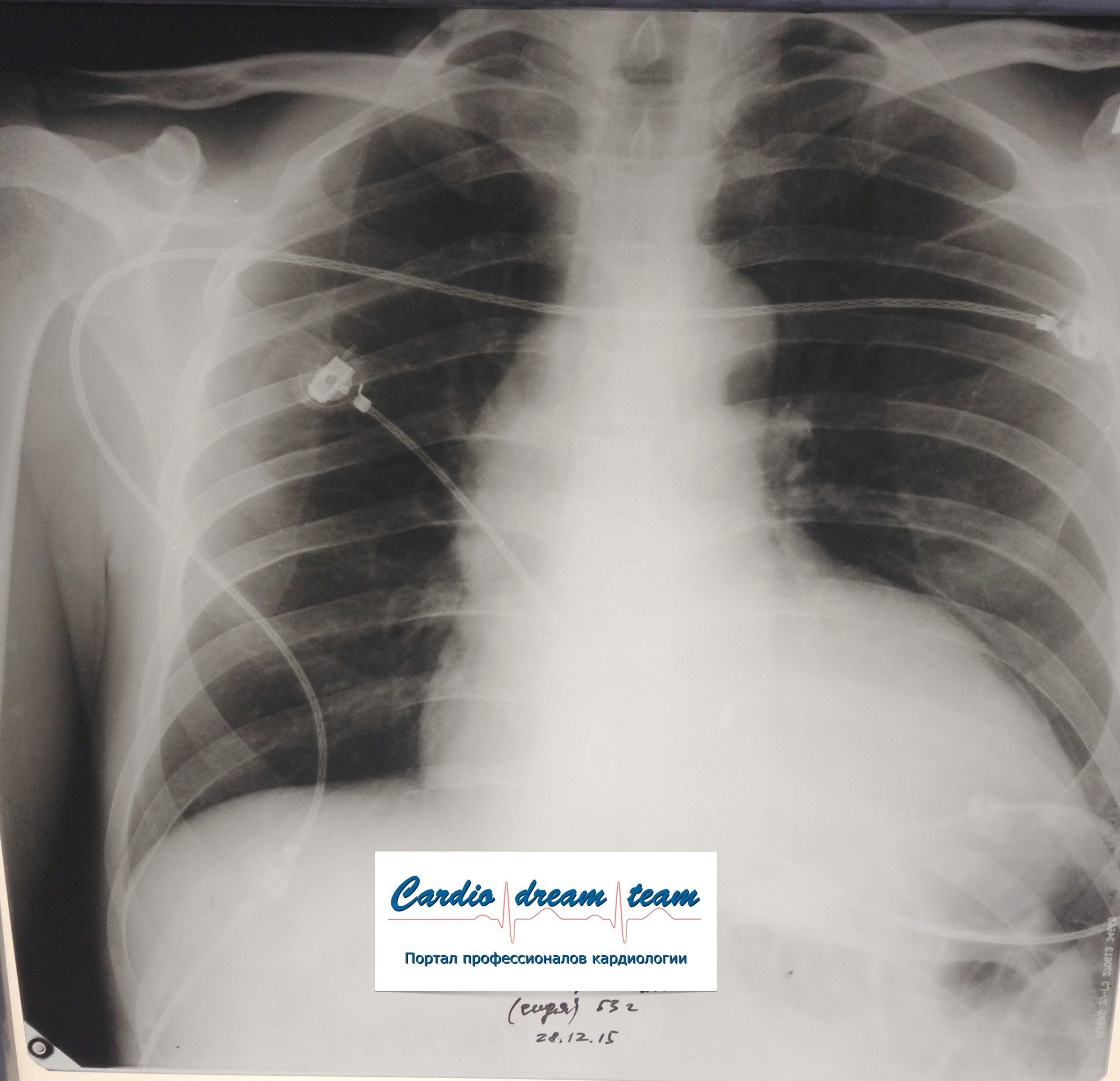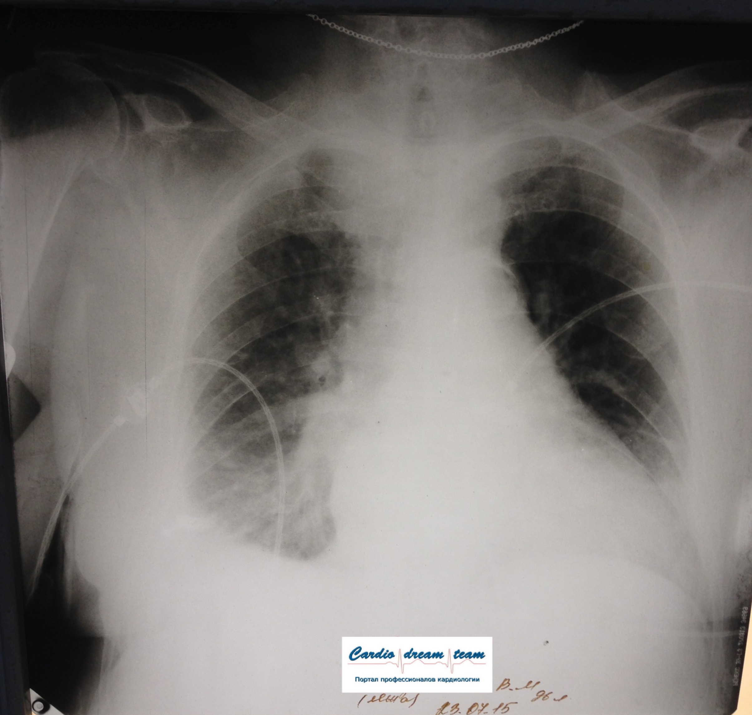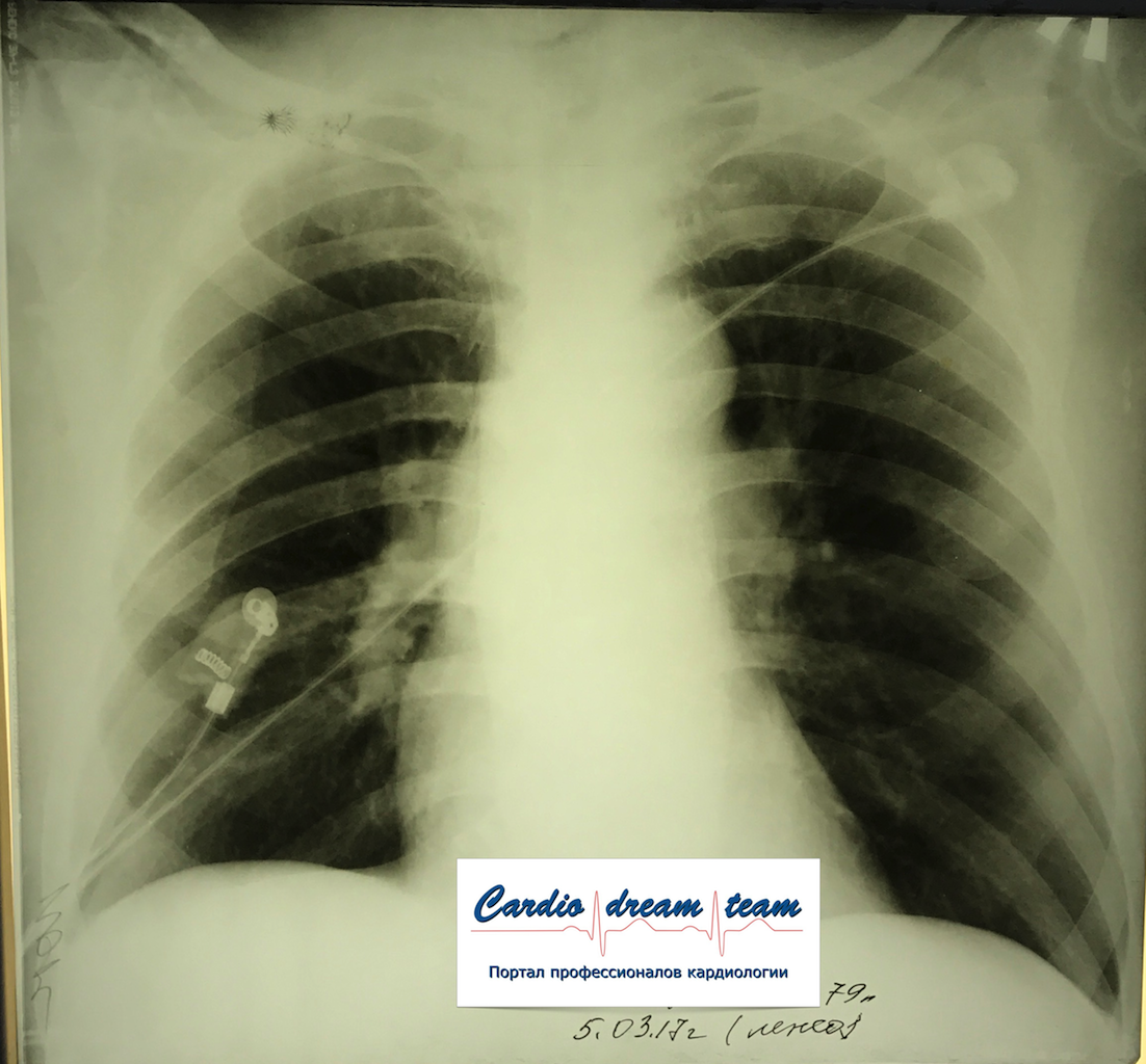 Не обсуждалась Дата 23-ИЮЛ-15 ОПИСАНИЕ: Проведена рентгенография органов грудной клетки в прямой проекции, положение лежа, условия ПИТ Легочные поля: неравномерно прозрачны за счет сосудистого обогащения, в базальных отделах с обеих сторон, отмечается сгущение легочного рисунка, за счет гиповентиляции, в плевральных полостях жидкость Легочный рисунок: Изменен по смешанному типу: обогащен за счет сосудистого компонента, деформирован за счет склероза. Корни: бесструктурны, расширены за счет сосудистого компонента, обогащены Синусы: определяется наличие жидкости по линии 5 ребра Сердце: широко лежит на диафрагме отмечается расширение границ сердечной тени влево, вправо экг-электроды. ЗАКЛЮЧЕНИЕ: Рентген-признаки 2-х стороннего гидроторакса с гиповентиляцией базальных сегментов.. Признаки застоя по МКК 2 степени (умеренно выраженный). Пневмосклероз. Р-признаки гипертрофии левого желудочка сердца. Склероз аорты.