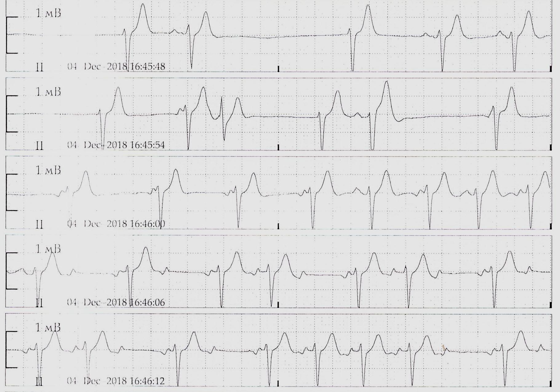 ФТП, затем выскальзывающий узловой ритм с формированием неполной АВ-диссоциации, видны "захваты".
