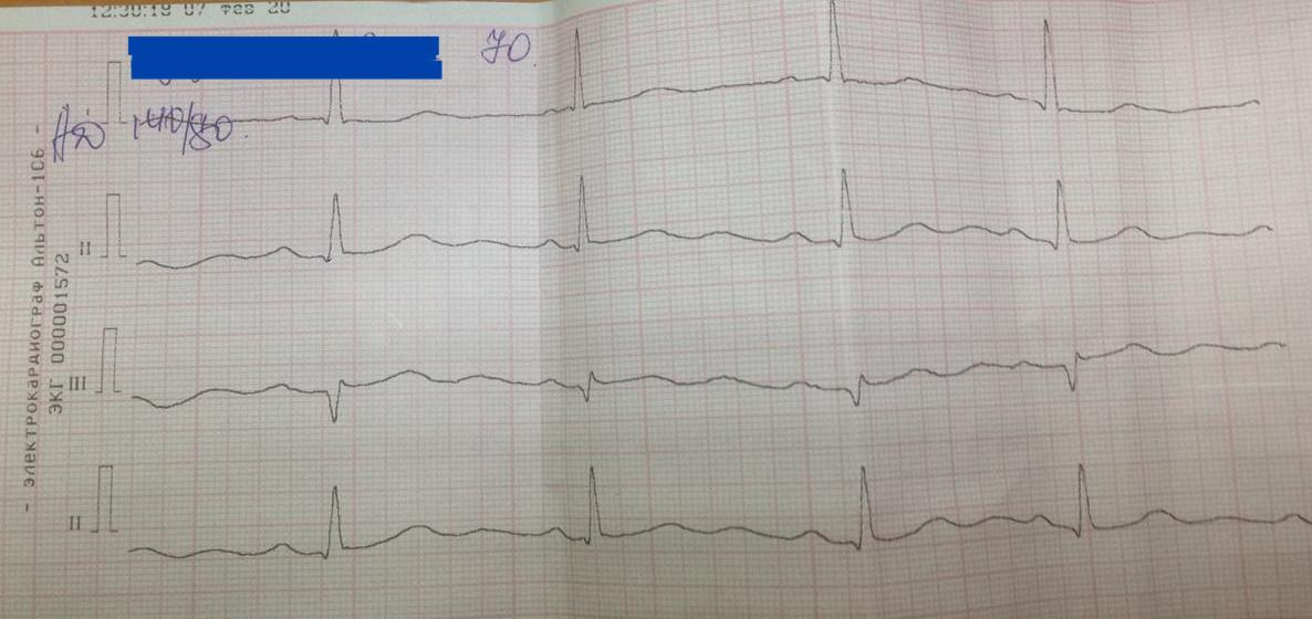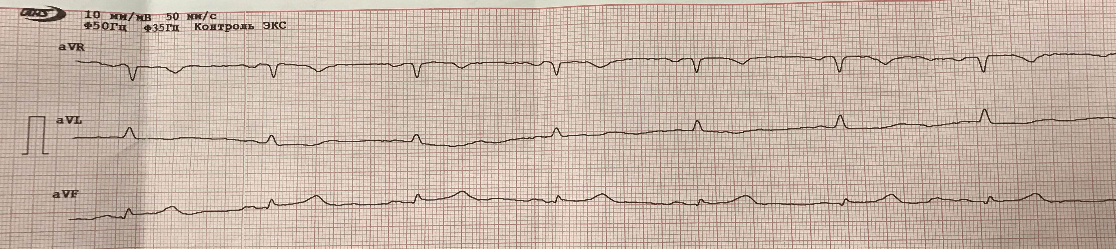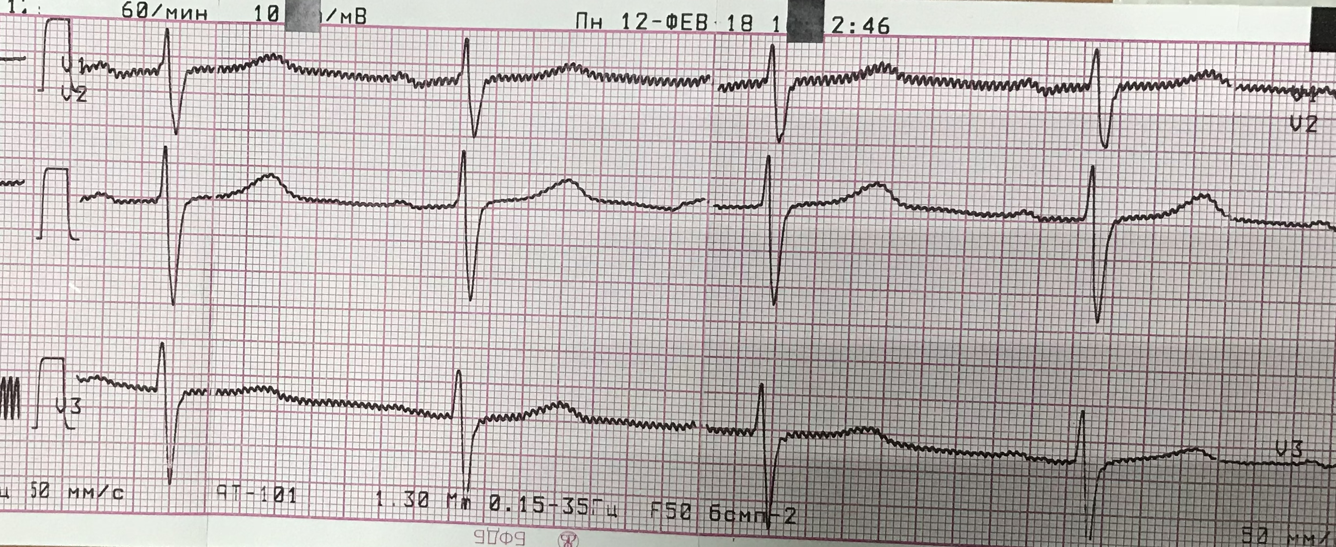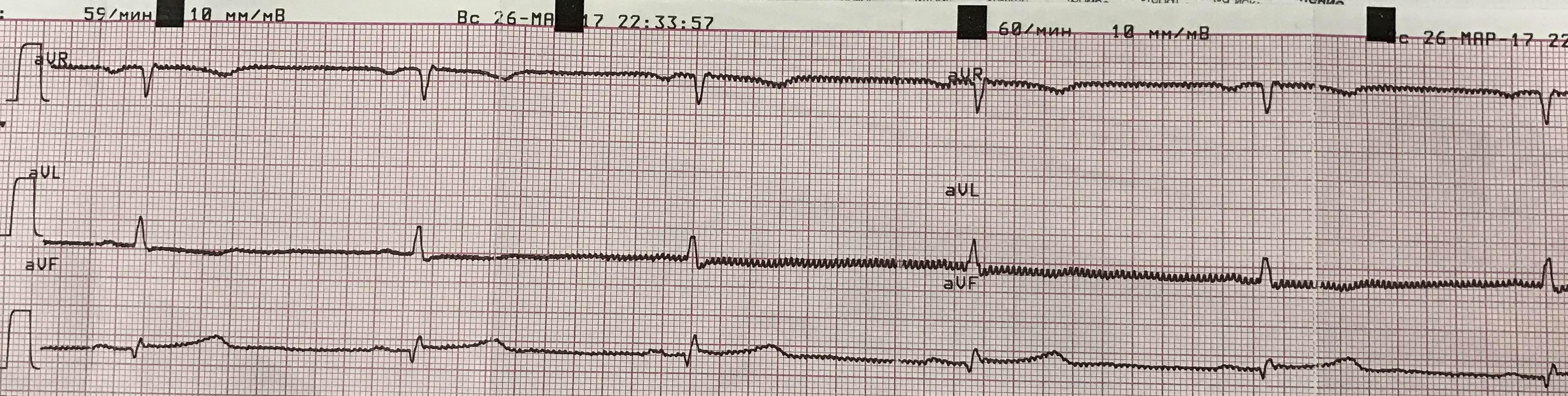 Малая элевация при БПНПГ. Для сравнения вариант не осложненной БПНПГ. Блокада разрешилась на следующий день.