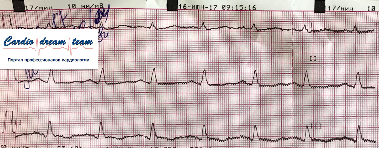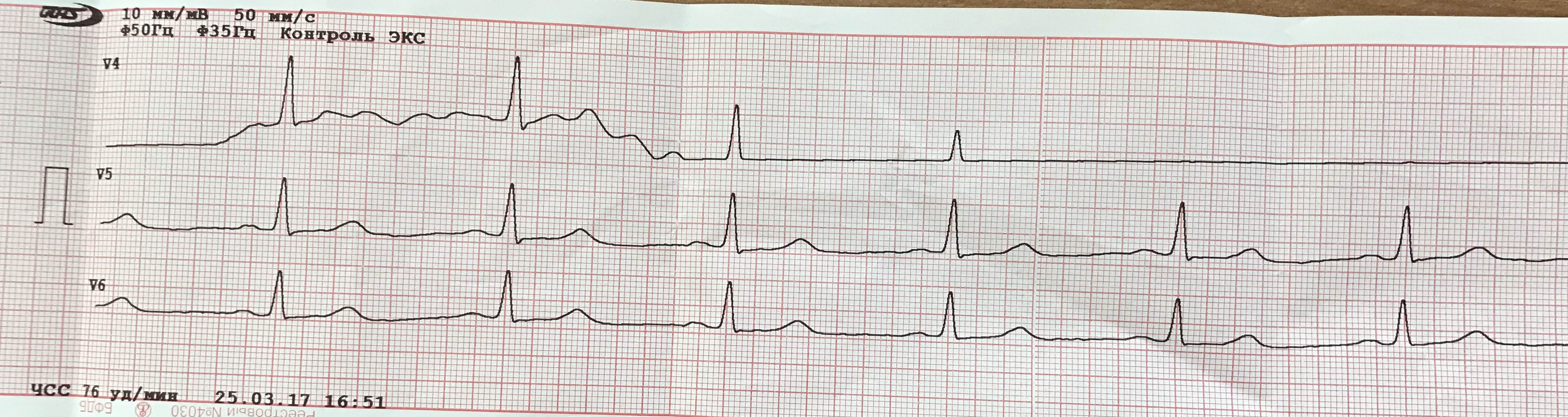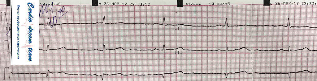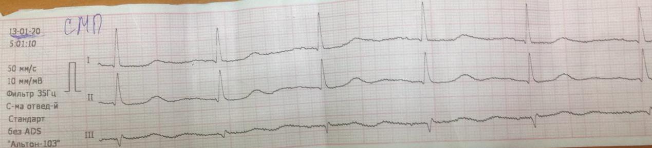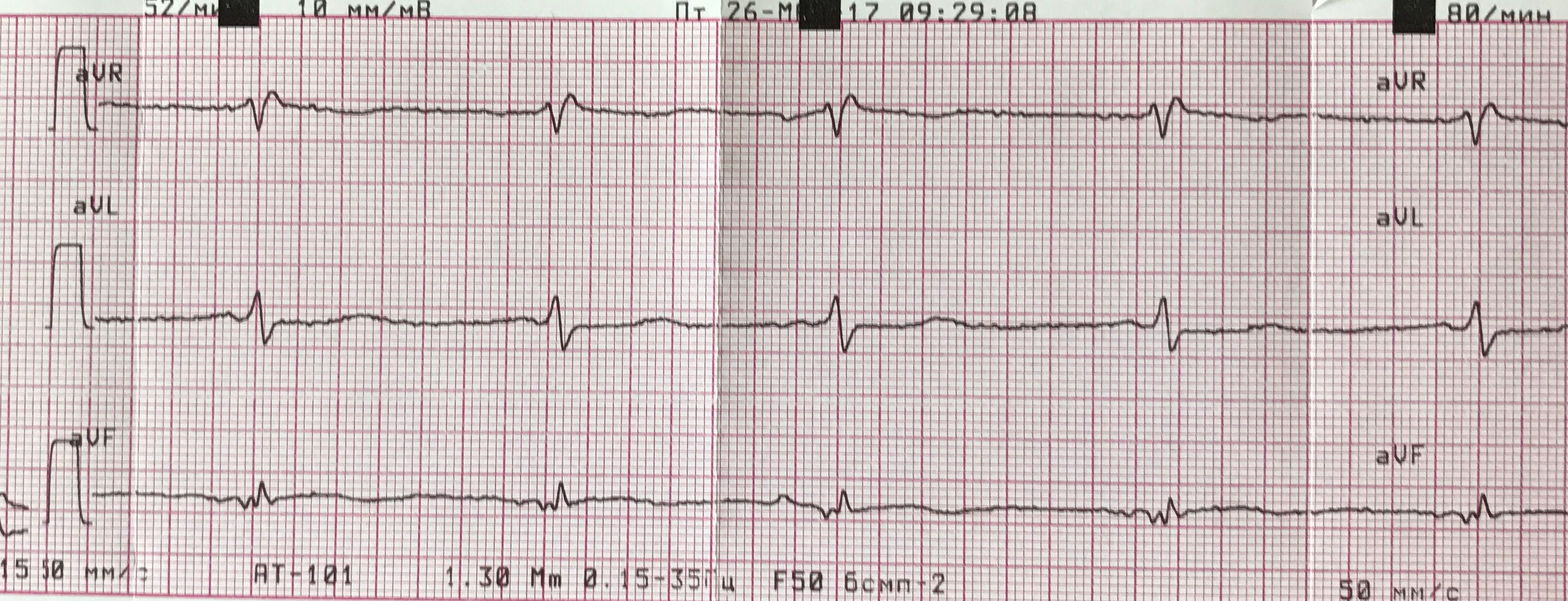 Малая элевация при БПНПГ. Для сравнения вариант не осложненной БПНПГ. Блокада разрешилась на следующий день.
