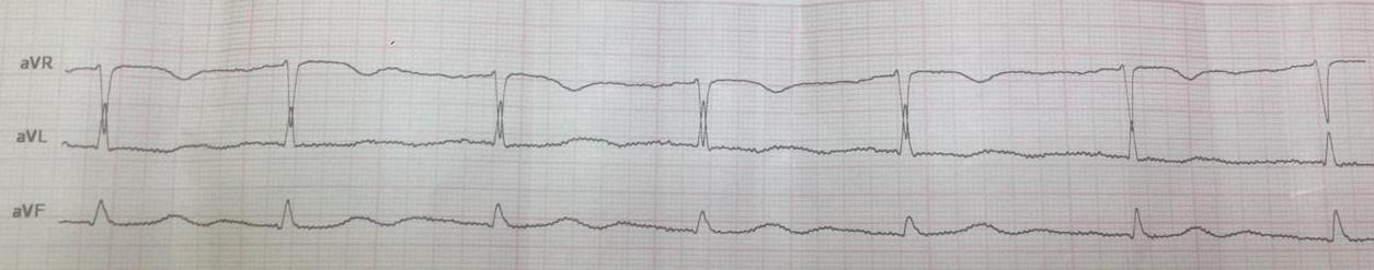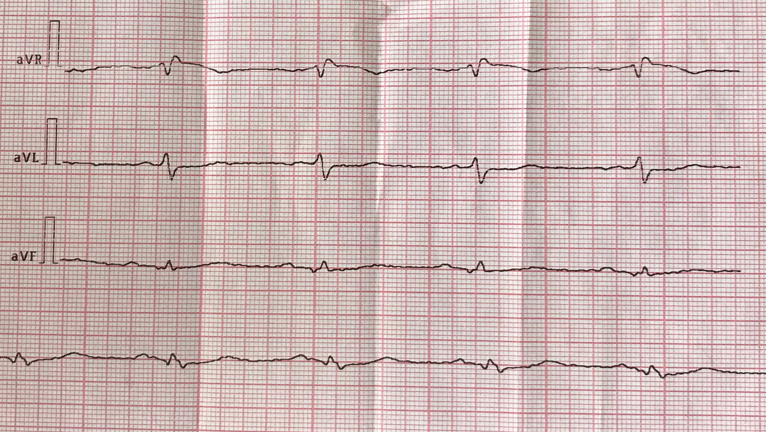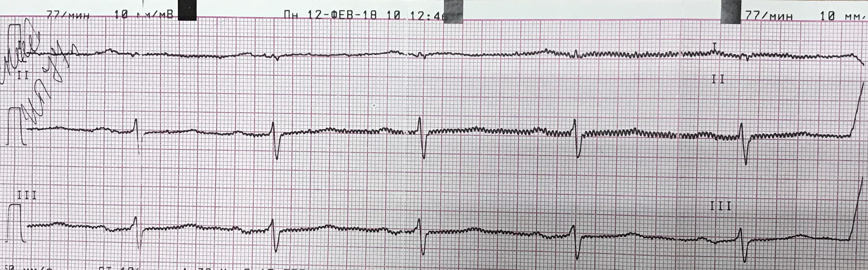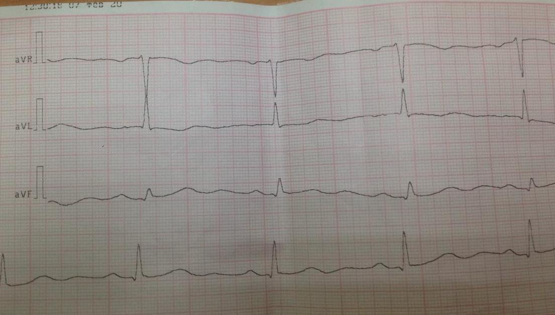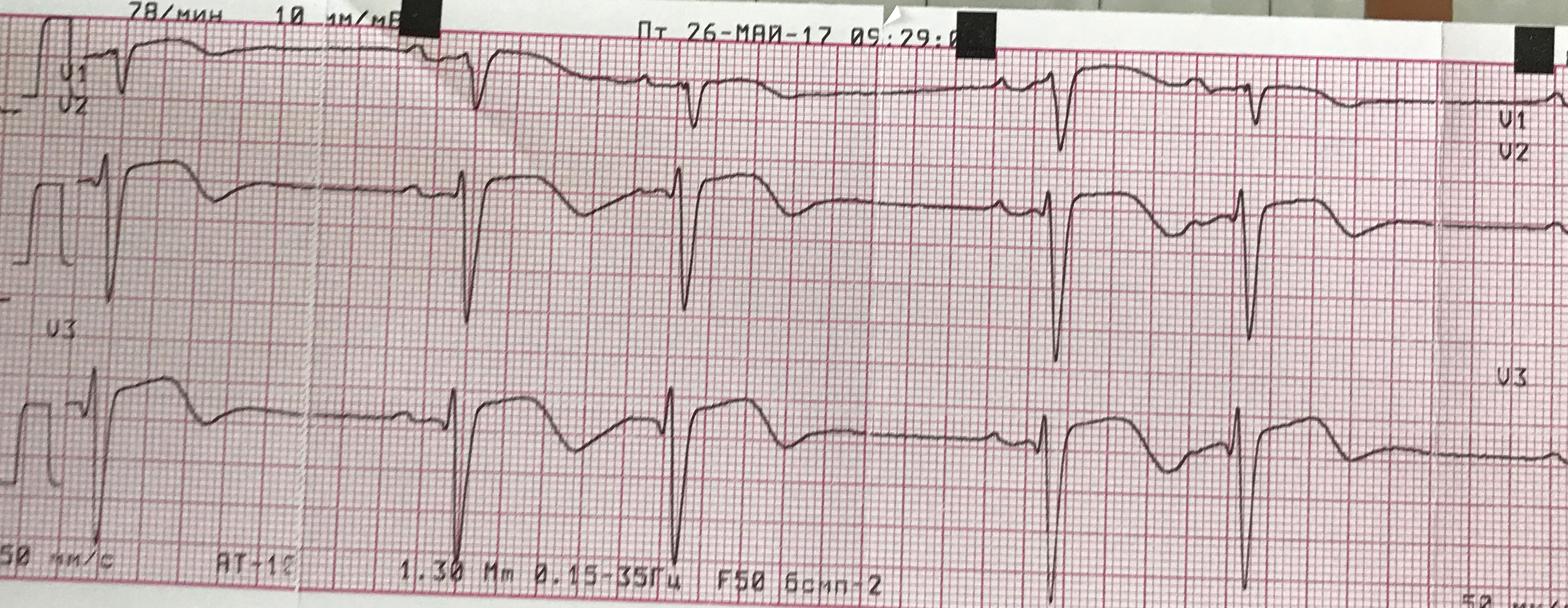 Малая элевация при БПНПГ. Для сравнения вариант не осложненной БПНПГ. Блокада разрешилась на следующий день.