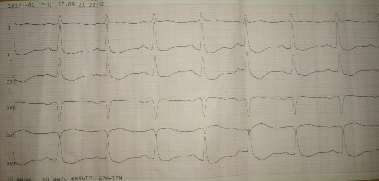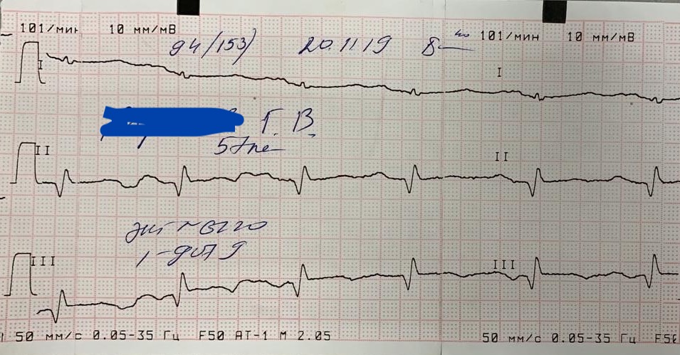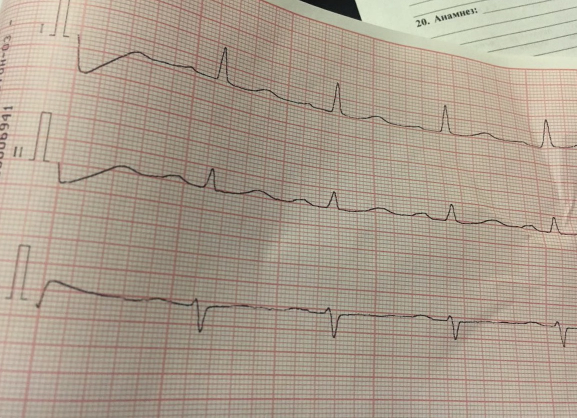 Не обсуждалась. Псевдо Такацубо. Вышла в подъезд - распылен баллончик с неизвестным газом. Боли за грудиной. На ЭКГ элевация. На КАГ - нет поражения коронарного русла. Тропонин повышен. На ЭХО гипокинез всей передней стенке. Горшка нет. ФВ снижена до 25. На ЭКГ динамика. Через неделю - зон нарушенного кинеза нет. ФВ - 60. ЭКГ в норме.