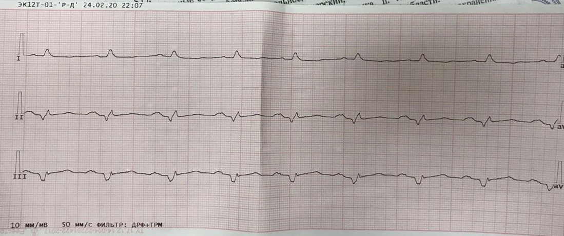 Признаки нижнего инфаркта. Но его нет. Основной диагноз: острая язва тонкой кишки, осложненная перфорацией. 25.02.2020 г. операция – лапаротомия, ушивание острой язвы тонкой кишки, холецистостомия, санация, дренирование брюшной полости. Осложнение основного: распространенный гнойный перитонит. СПОН. Сопутствующий: гипертоническая болезнь III. Степень АГ 2. Риск 3. ХСН IIА. ФК II. ЖКБ. Хронический холецистит. Холедохолитиаз.