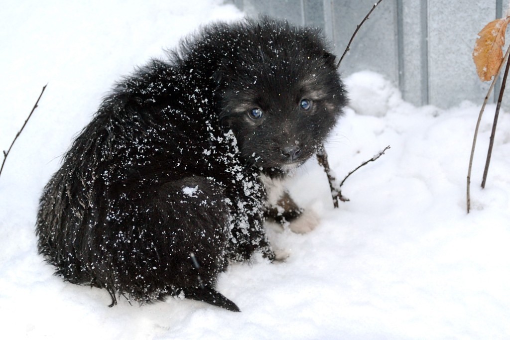 При виде человека с фотоаппаратом один щенок заскулил и забился в снег к забору.