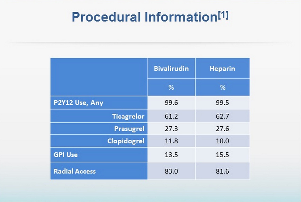 В исследовании HORIZONS было показано, что на госпитальном этапе терапия бивалирудином снижает частоту кровотечений и смертность после первичного чрескожного коронарного вмешательства (ЧКВ), в сравнении с гепарином и традиционными ингибиторами гликопротеина IIb/IIIa (ИГП). Остается неизвестным, сохраняется ли это преимущество бивалирудина при применении монотерапии гепарином с назначением ИГП только в экстренных случаях.
