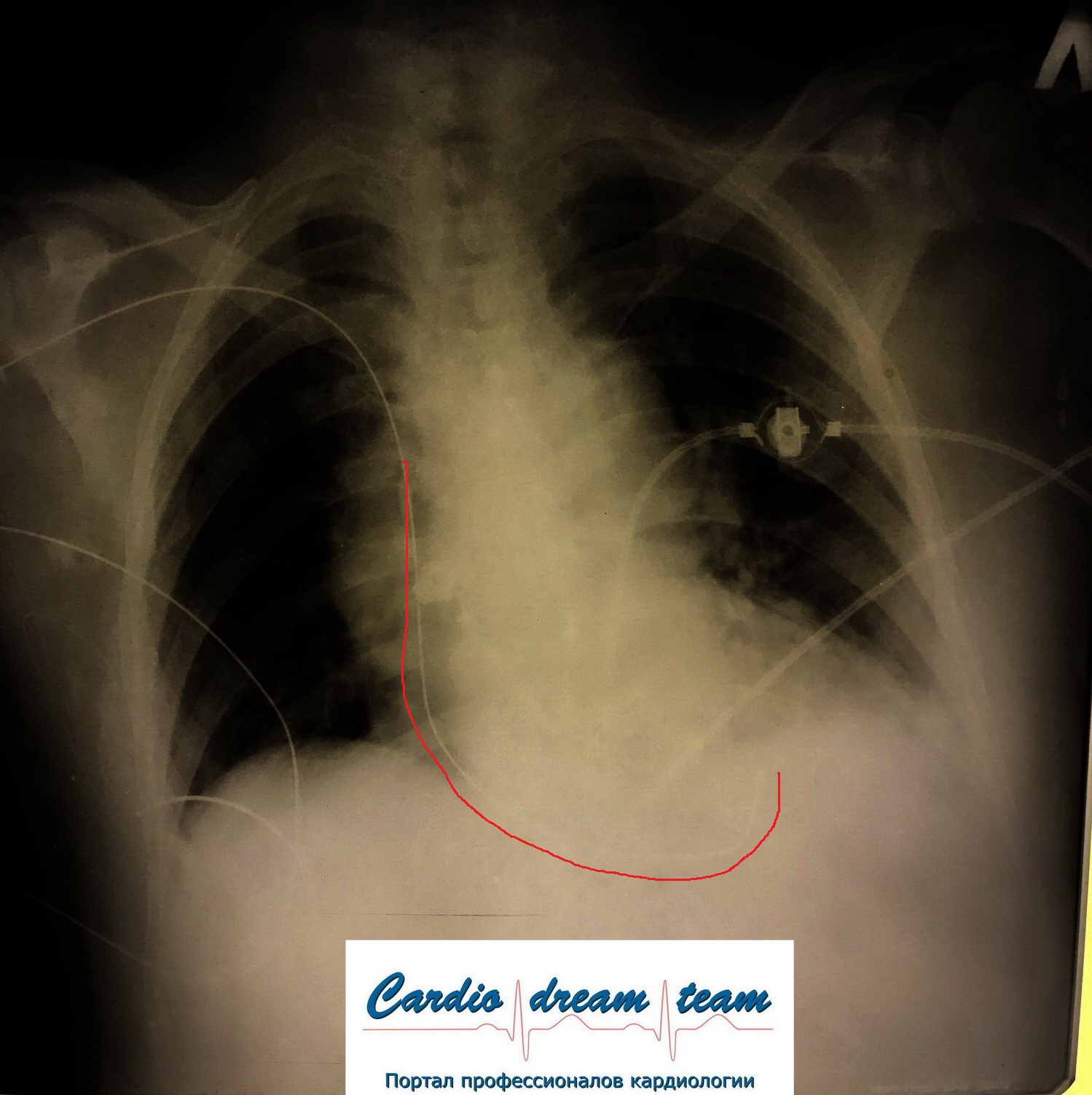 Затемненная рентгенограмма, чтобы посмотреть, что электрод временного кардиостимулятора стоит на месте - уперся в стенку правого желудочка.
