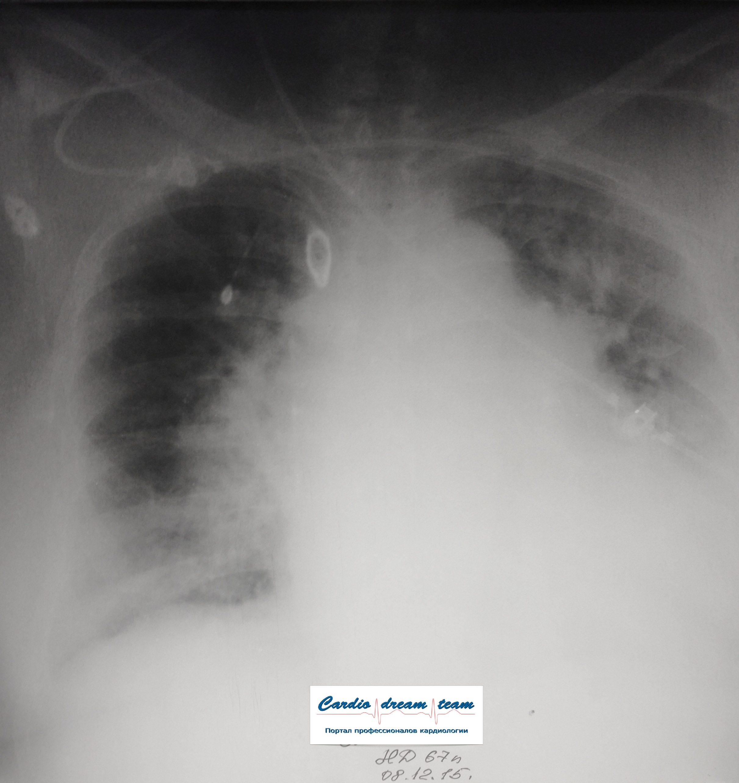 Не обсуждалась Дата 23-ИЮЛ-15 ОПИСАНИЕ: Проведена рентгенография органов грудной клетки в прямой проекции, положение лежа, условия ПИТ Легочные поля: неравномерно прозрачны за счет сосудистого обогащения, в базальных отделах с обеих сторон, отмечается сгущение легочного рисунка, за счет гиповентиляции, в плевральных полостях жидкость Легочный рисунок: Изменен по смешанному типу: обогащен за счет сосудистого компонента, деформирован за счет склероза. Корни: бесструктурны, расширены за счет сосудистого компонента, обогащены Синусы: определяется наличие жидкости по линии 5 ребра Сердце: широко лежит на диафрагме отмечается расширение границ сердечной тени влево, вправо экг-электроды. ЗАКЛЮЧЕНИЕ: Рентген-признаки 2-х стороннего гидроторакса с гиповентиляцией базальных сегментов.. Признаки застоя по МКК 2 степени (умеренно выраженный). Пневмосклероз. Р-признаки гипертрофии левого желудочка сердца. Склероз аорты.