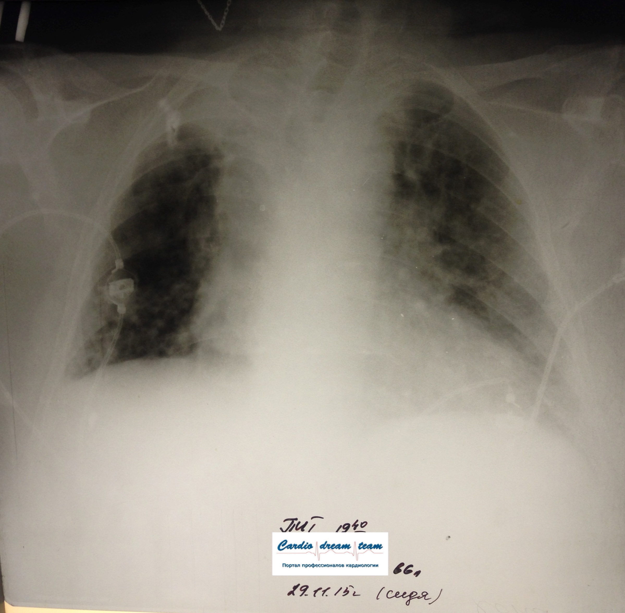 Не обсуждалась Дата 23-ИЮЛ-15 ОПИСАНИЕ: Проведена рентгенография органов грудной клетки в прямой проекции, положение лежа, условия ПИТ Легочные поля: неравномерно прозрачны за счет сосудистого обогащения, в базальных отделах с обеих сторон, отмечается сгущение легочного рисунка, за счет гиповентиляции, в плевральных полостях жидкость Легочный рисунок: Изменен по смешанному типу: обогащен за счет сосудистого компонента, деформирован за счет склероза. Корни: бесструктурны, расширены за счет сосудистого компонента, обогащены Синусы: определяется наличие жидкости по линии 5 ребра Сердце: широко лежит на диафрагме отмечается расширение границ сердечной тени влево, вправо экг-электроды. ЗАКЛЮЧЕНИЕ: Рентген-признаки 2-х стороннего гидроторакса с гиповентиляцией базальных сегментов.. Признаки застоя по МКК 2 степени (умеренно выраженный). Пневмосклероз. Р-признаки гипертрофии левого желудочка сердца. Склероз аорты.