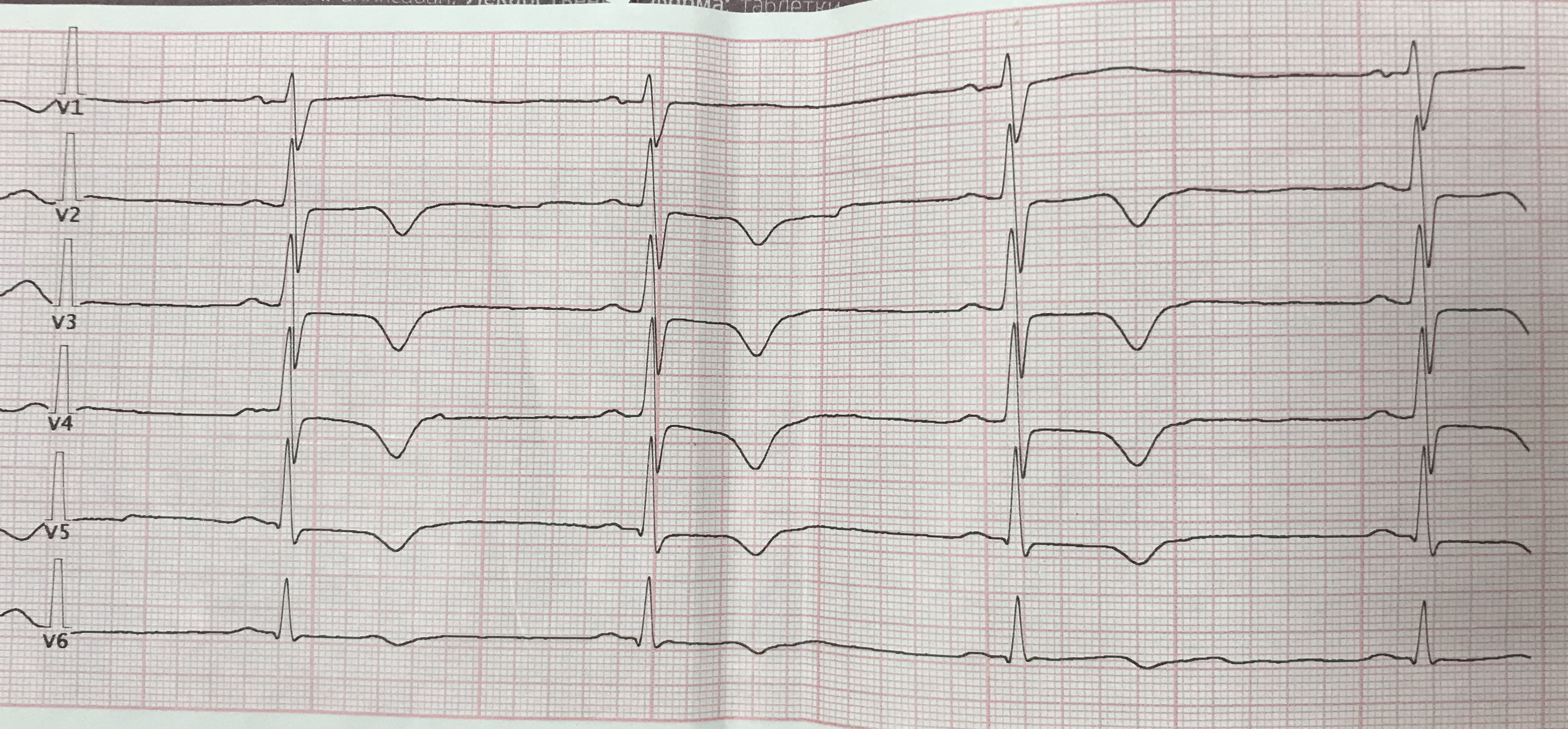 Здесь нет поражения ствола, несмотря на большое количество депрессий ST потому, что ST косонисходящий, а должен быть горизонтальным. На КАГ рестеноз стента ПКА. Ранее стентирована ПНА и ЗМЖВ.