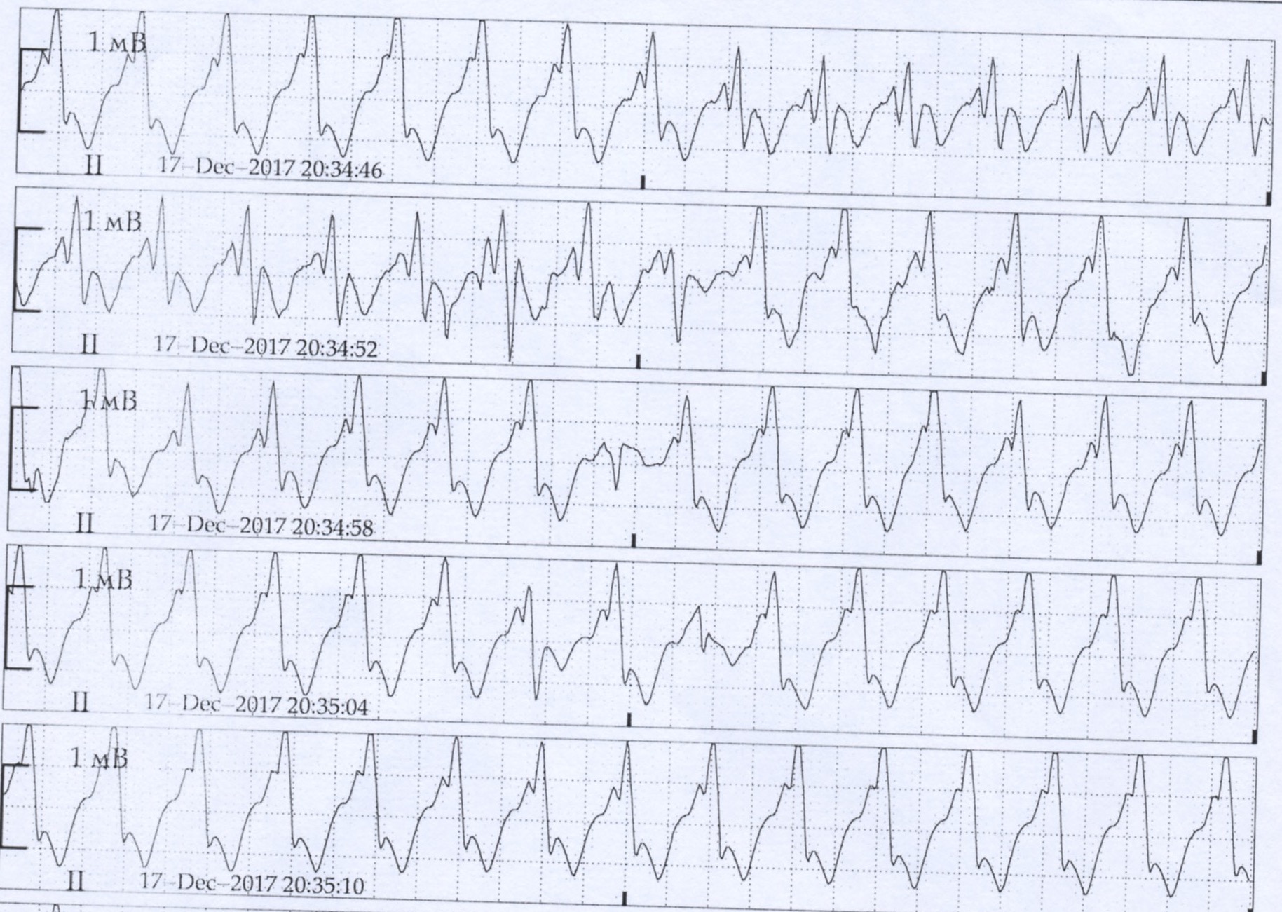 Ж 59 лет. Пароксизмы ФП более 5 лет. Принимает постоянно соталол. Для купирования приступа приняла ещё и пропанорм 4 таблетки за 1 час. И теперь ЖТ