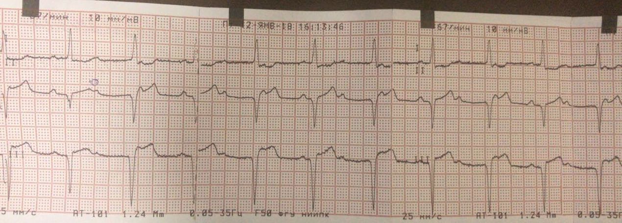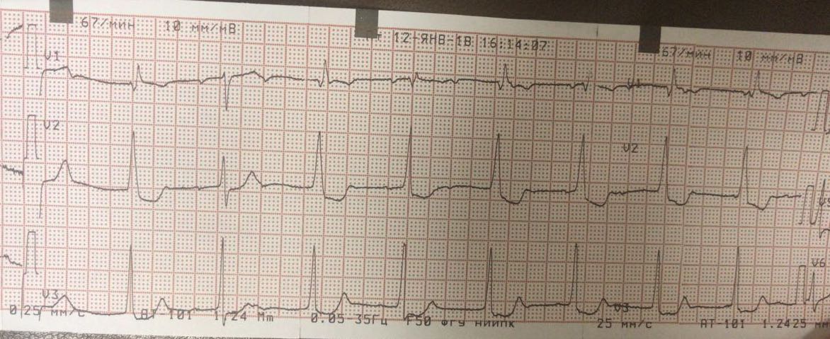 16.13 – в стандартных полная с учащением ритма (вводили атропин?) В усиленных 2:1 В 16-14 - В грудных полная с замещающим ритмом из разных источников, есть и аберрантные В 17.33 – АВ блокада 2 степени с Венкебахом на первом скане, на втором 2:1