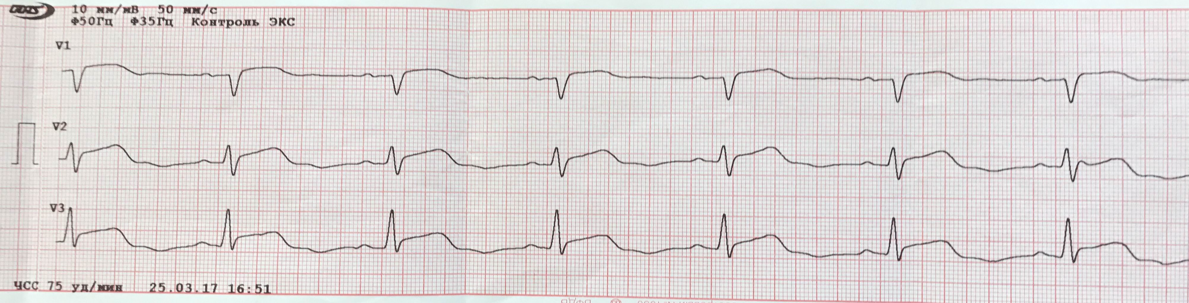 Малая элевация при БПНПГ. Для сравнения вариант не осложненной БПНПГ. Блокада разрешилась на следующий день.