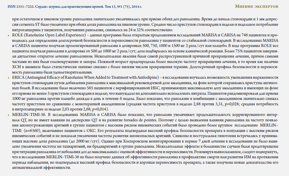 Что-то накинулись на ранолазин в исследованиях. Вероятно, что-то докажут. Наше отделение участвует в RIVER PCI, где хотят доказать его эффективность у не полностью реваскуляризированных больных. О результатах говорить рано. Размещаю результаты «TERISA» и фрагмент статьи Татарского, где ранолазин представлен как антиаритмик. Саму статью также прилагаю.