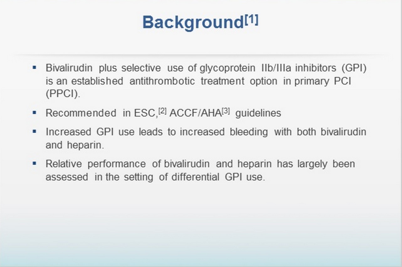 В исследовании HORIZONS было показано, что на госпитальном этапе терапия бивалирудином снижает частоту кровотечений и смертность после первичного чрескожного коронарного вмешательства (ЧКВ), в сравнении с гепарином и традиционными ингибиторами гликопротеина IIb/IIIa (ИГП). Остается неизвестным, сохраняется ли это преимущество бивалирудина при применении монотерапии гепарином с назначением ИГП только в экстренных случаях.
