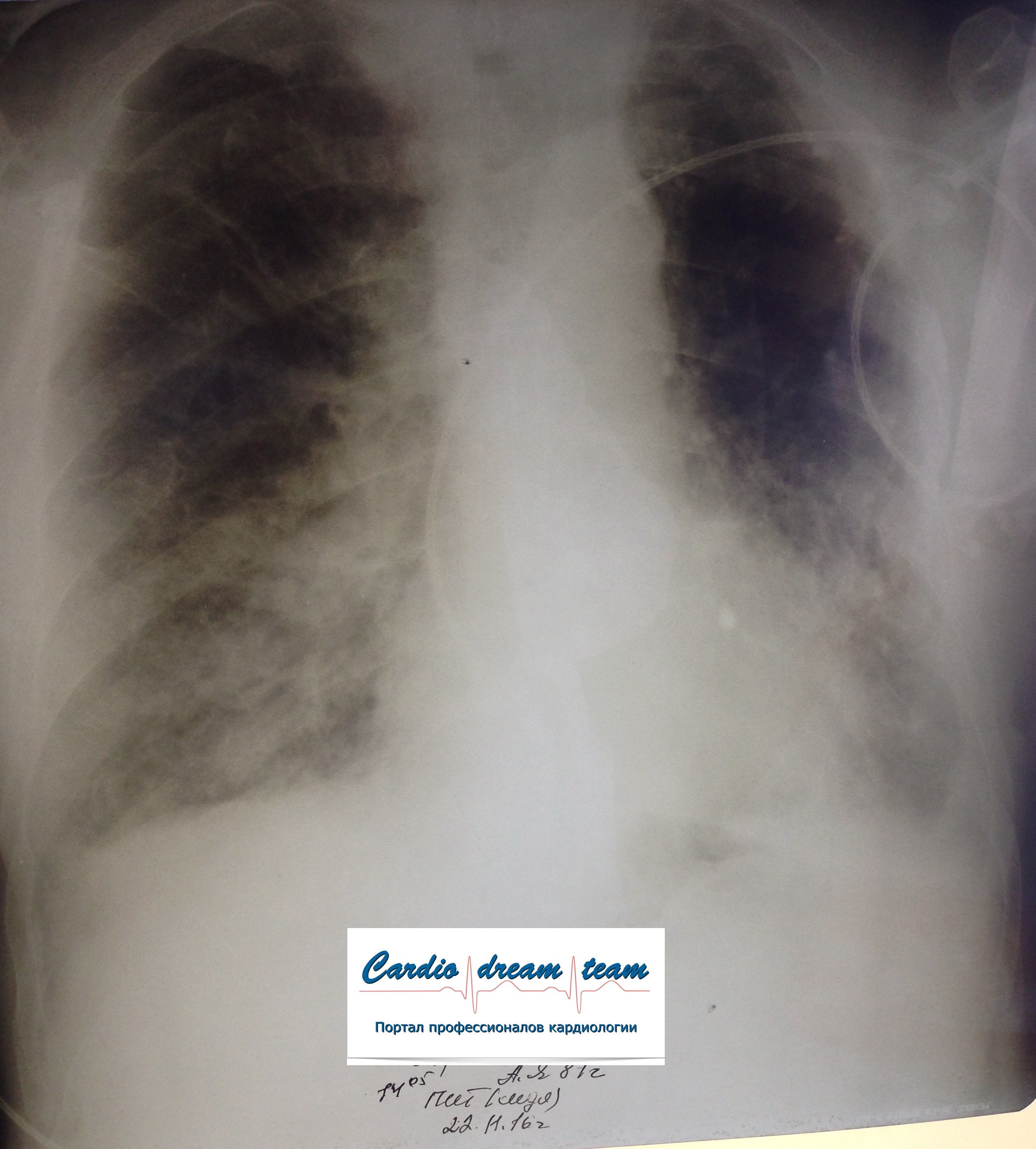 Не обсуждалась Дата 23-ИЮЛ-15 ОПИСАНИЕ: Проведена рентгенография органов грудной клетки в прямой проекции, положение лежа, условия ПИТ Легочные поля: неравномерно прозрачны за счет сосудистого обогащения, в базальных отделах с обеих сторон, отмечается сгущение легочного рисунка, за счет гиповентиляции, в плевральных полостях жидкость Легочный рисунок: Изменен по смешанному типу: обогащен за счет сосудистого компонента, деформирован за счет склероза. Корни: бесструктурны, расширены за счет сосудистого компонента, обогащены Синусы: определяется наличие жидкости по линии 5 ребра Сердце: широко лежит на диафрагме отмечается расширение границ сердечной тени влево, вправо экг-электроды. ЗАКЛЮЧЕНИЕ: Рентген-признаки 2-х стороннего гидроторакса с гиповентиляцией базальных сегментов.. Признаки застоя по МКК 2 степени (умеренно выраженный). Пневмосклероз. Р-признаки гипертрофии левого желудочка сердца. Склероз аорты.