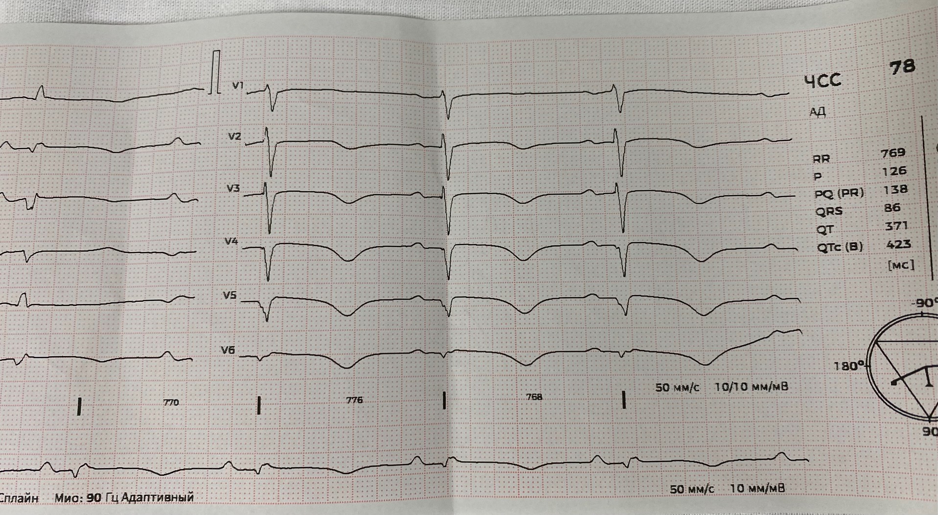 Клинический случай. Ж 77 лет. Поступила с ОИМ. Стентирована ПНА. Запись ЭКГ 4 утра. Через несколько часов рецидив загрудинной боли. Запись ЭКГ (8 утра). По нижней стенке элевация, не большая но достоверная. Повторно КАГ. Всё спокойно. Но диагностирована жидкость в перикарде,нарастание гипотонии. Выполнена пункция перикарда, удалена кровь. Диагностирован наружный разрыв миокарда. Асистолия. Реанимация без успеха. Чем интересна ЭКГ? Зафиксирован момент накопления жидкости, как признак начинающего гемоперикарда.