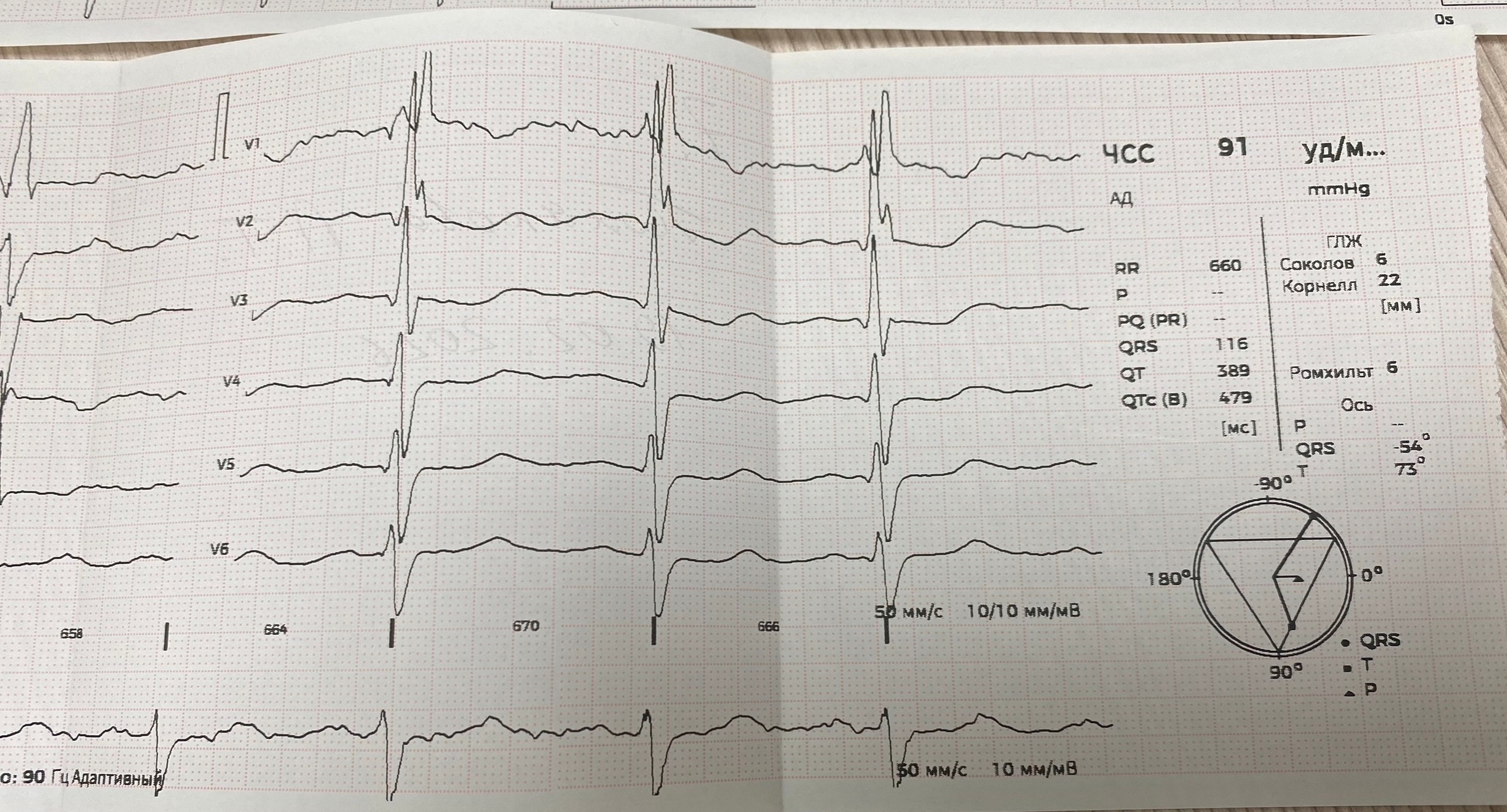 Здесь нет поражения ствола, несмотря на большое количество депрессий ST потому, что ST косонисходящий, а должен быть горизонтальным. На КАГ рестеноз стента ПКА. Ранее стентирована ПНА и ЗМЖВ.