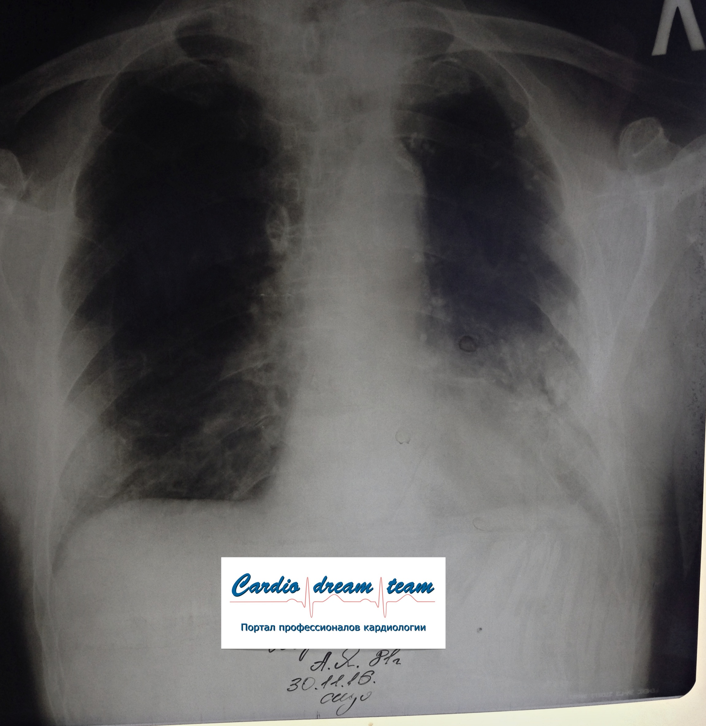 Не обсуждалась Дата 23-ИЮЛ-15 ОПИСАНИЕ: Проведена рентгенография органов грудной клетки в прямой проекции, положение лежа, условия ПИТ Легочные поля: неравномерно прозрачны за счет сосудистого обогащения, в базальных отделах с обеих сторон, отмечается сгущение легочного рисунка, за счет гиповентиляции, в плевральных полостях жидкость Легочный рисунок: Изменен по смешанному типу: обогащен за счет сосудистого компонента, деформирован за счет склероза. Корни: бесструктурны, расширены за счет сосудистого компонента, обогащены Синусы: определяется наличие жидкости по линии 5 ребра Сердце: широко лежит на диафрагме отмечается расширение границ сердечной тени влево, вправо экг-электроды. ЗАКЛЮЧЕНИЕ: Рентген-признаки 2-х стороннего гидроторакса с гиповентиляцией базальных сегментов.. Признаки застоя по МКК 2 степени (умеренно выраженный). Пневмосклероз. Р-признаки гипертрофии левого желудочка сердца. Склероз аорты.